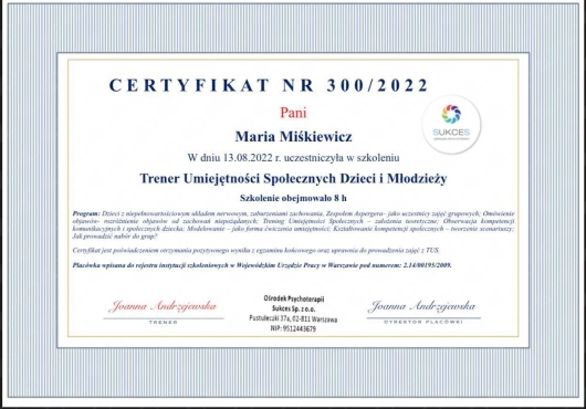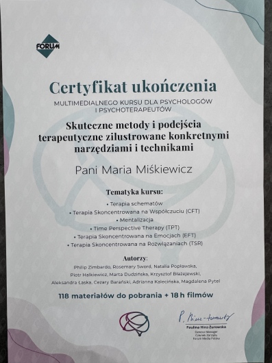 Maria jest niesamowicie otwarta i pełna empatii. Za nami 11 miesięcy wspólnej pracy. Jestem niesamowicie zadowolona z efektów. Nie spodziewałam się tak dużych efektów, ale muszę powiedzieć; że to duże szczęście trafić na tak profesjonalną osobę