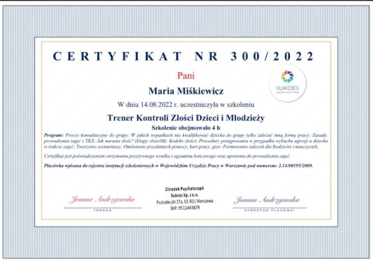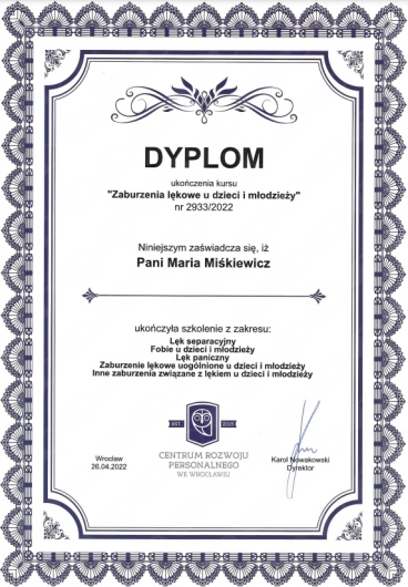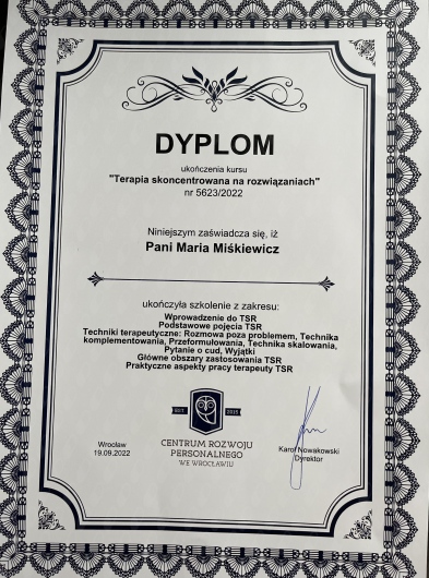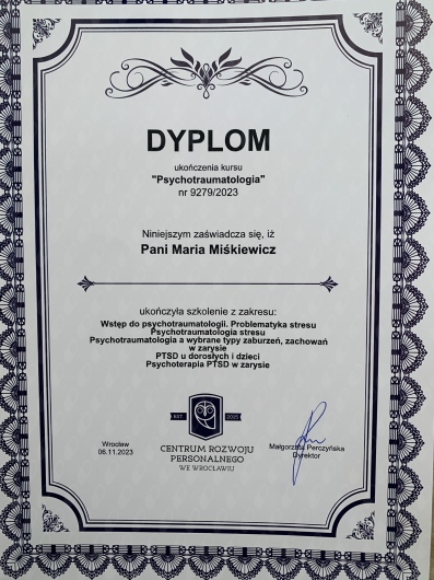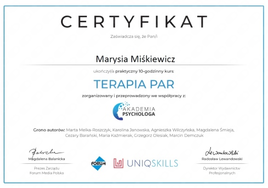 Regularnie poszerzam swoją wiedzę, uczestnicząc w certyfikowanych kursach i szkoleniach z zakresu terapii par, zaburzeń emocjonalnych, pracy z traumą oraz terapii skoncentrowanej na rozwiązaniach (TSR).