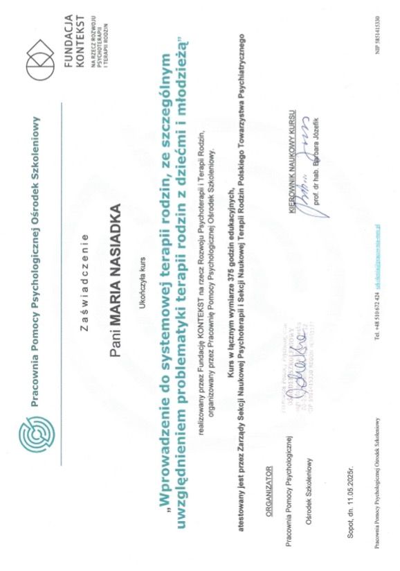 Jaki jest zakres porad oferowanych przez Maria Nasiadka?Maria Nasiadka to psycholog, psychoterapeuta. Na podstawie swojego doświadczenia i wykształcenia Maria Nasiadka oferuje usługi takie jak: Konsultacja psychologiczna, psychoterapia systemowa, poradnictwo psychologiczne, psychoterapia rodzinna, psychoterapia młodzieży, psychoedukacja, psychoterapia (pierwsza wizyta), psychoterapia par, psychoterapia indywidualna, testy psychologiczne.