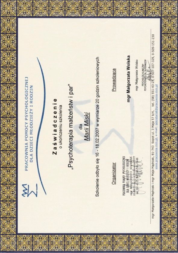 Ukończyłam psychologie na WNS na Uniwersytecie Gdańskim w 2008 r. Od 17 lat pracuje z dziećmi i młodzieżą jako psycholog, pomagając im w różnych sytuacjach. Pracowałam zarówno w placówkach oświatowych, Specjalnym Ośrodku Szkolno- Wychowawczym z dziećmi i młodzieżą z niepełnosprawnością, w poradni psychologiczno- pedagogicznej. Aktualnie pracuje na Dziennym Oddziale psychiatrycznym rehabilitacyjnym młodzieżowym w Gdyni. Jestem psychoterapeutą systemowym w trakcie szkolenia, na 3 roku. Przyjmuje w swoim gabinecie młodzież, dzieci oraz prowadzę sesję terapii rodzinnej.