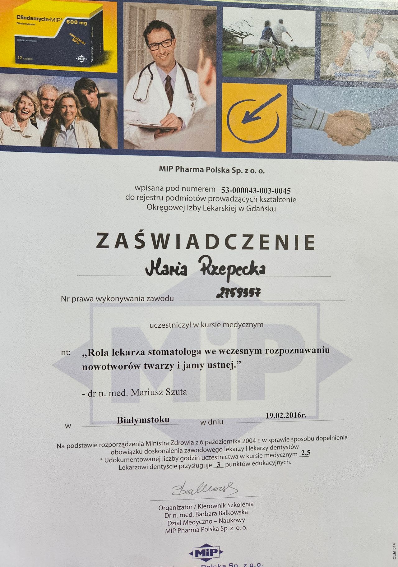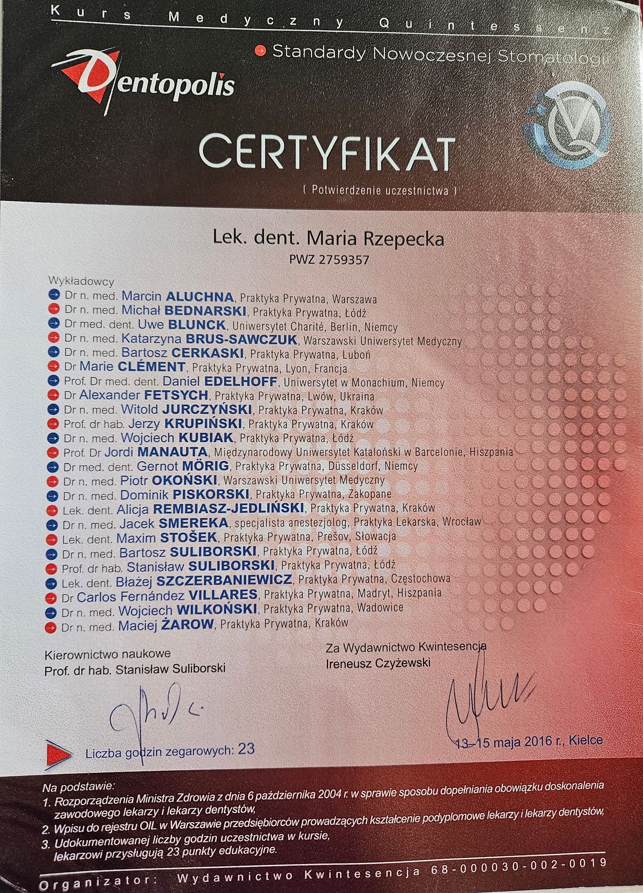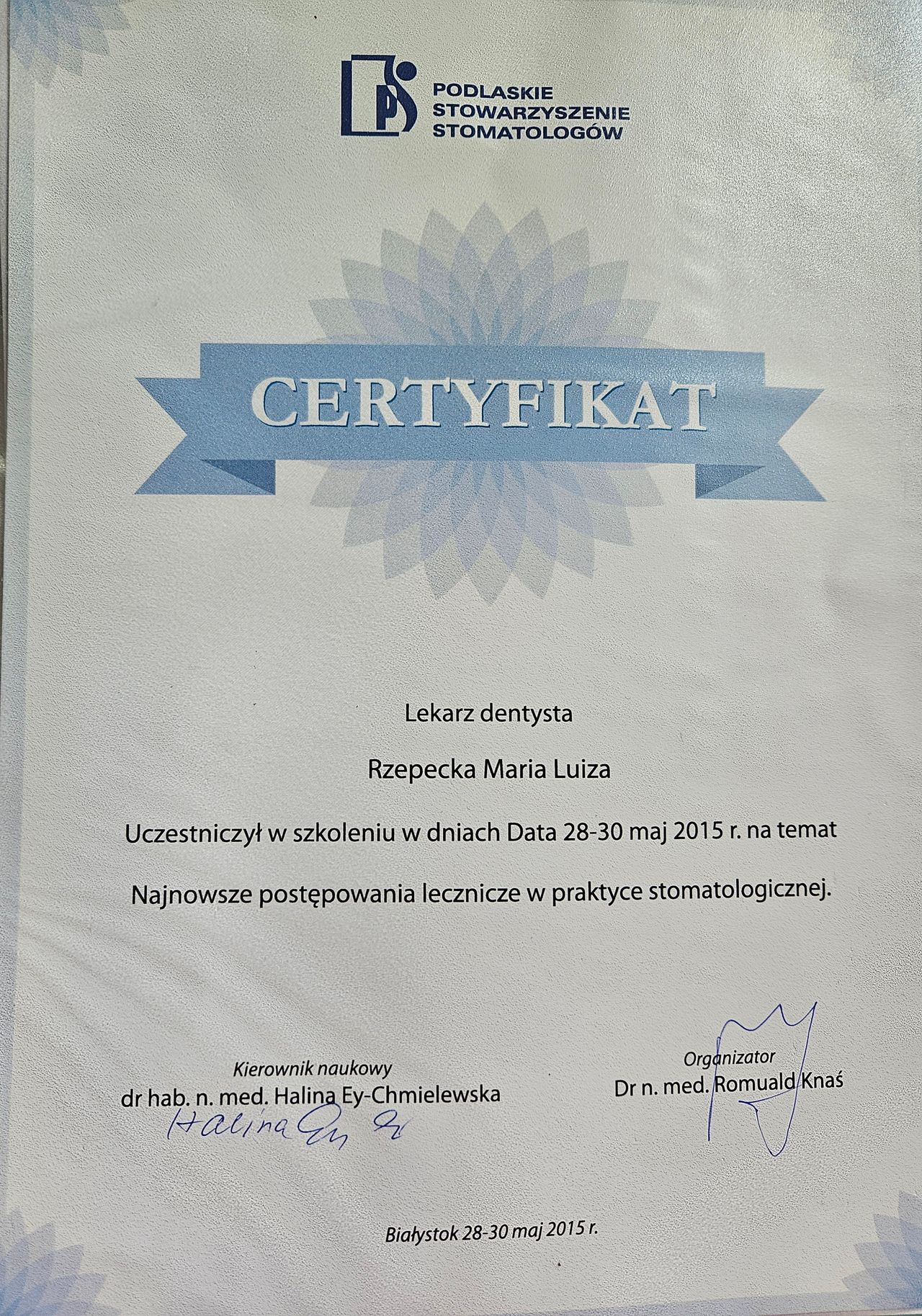 Jestem lekarzem dentystą, absolwentką Uniwersytetu Medycznego w Białymstoku w 2013 roku. Jestem także specjalistą zdrowia publicznego. Mam ponad 10 letnie doświadczenie w pracy jako stomatolog. W swojej pracy zajmuję się leczeniem zębów dorosłych, jak i dziecim.in.: - leczenie zachowawcze - stomatologia dziecięca - leczenie próchnicy - leczenie bólu, przy czym to praca z małymi pacjentami przynosi mi szczególnie dużo radości i satysfakcji.