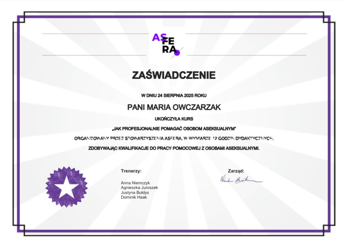 Jestem psychologiem, ukończyłam jednolite studia magisterskie na kierunku Psychologia na Uniwersytecie Jagiellońskim. Obecnie kontynuuję kształcenie w studium podyplomowym psychoterapii dzieci i młodzieży w Instytucie Psychoedukacji w Poznaniu oraz w czteroletniej szkole psychoterapii poznawczo-behawioralnej (CBT) – Ter-Cognitiva w Krakowie, akredytowanej przez PTTPB.