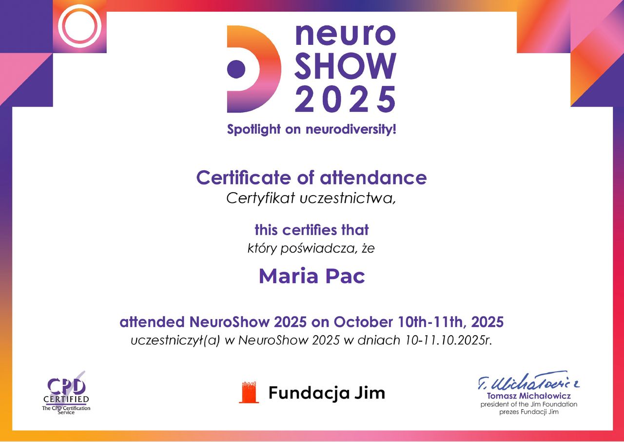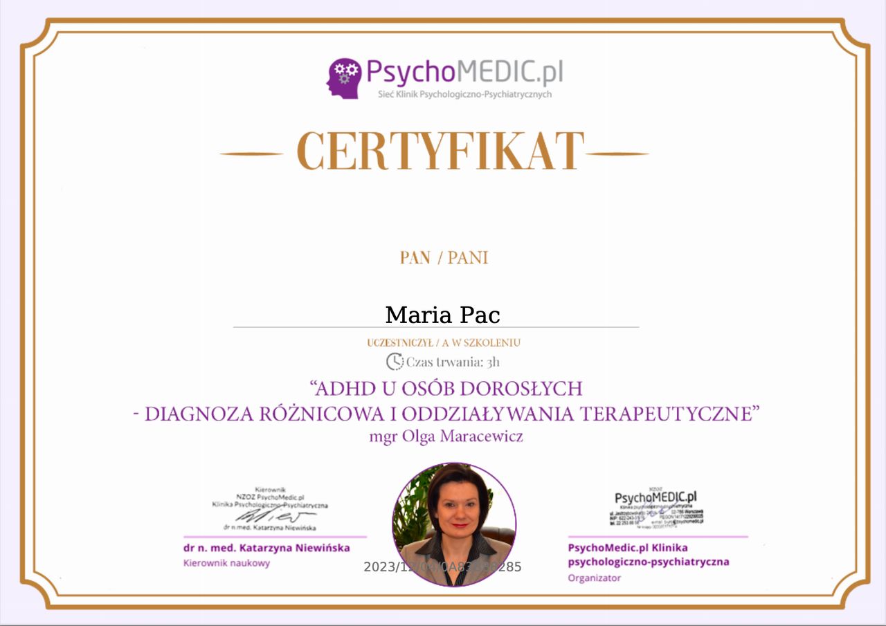 Wszystkim, którzy chcą być rzetelnie zdiagnozowani na ADHD, polecam wizytę u Pani Marii Pac. Zgłosilem się do Niej w celu diagnozy ADHD, a wcześniej długo szukałem odpowiedniej osoby, ponieważ miałem już w przeszłości negatywne doświadczenia z innymi psychologami.