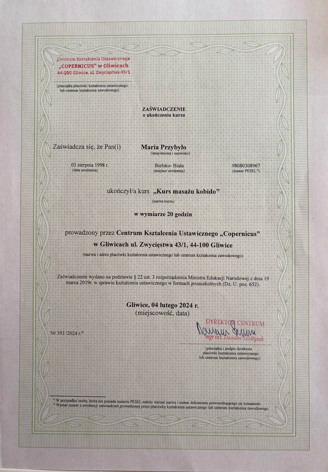 Jaki jest zakres porad oferowanych przez Maria Przybyło?Maria Przybyło to fizjoterapeuta. Na podstawie swojego doświadczenia i wykształcenia Maria Przybyło oferuje usługi takie jak: konsultacja fizjoterapeutyczna, masaż Kobido, Terapia tkanek miękkich, fizjoterapia, Terapia manualna, terapia mięśniowo-powięziowa, fizjoterapia stomatologiczna, Fizjoterapia stawów skroniowo-żuchwowych.