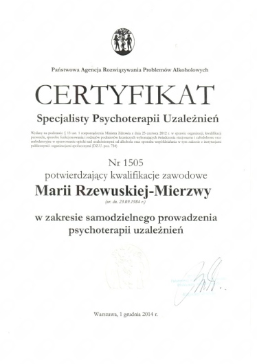 Specjalista Psychoterapii Uzależnień - certyfikat nr 1505 Państwowej Agencji Rozwiązywania Problemów Alkoholowych (rok 2014)
