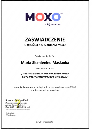 Swoją pracę regularnie poddaję superwizji, dbając o wysoką jakość pomocy i bezpieczeństwo moich pacjentów.