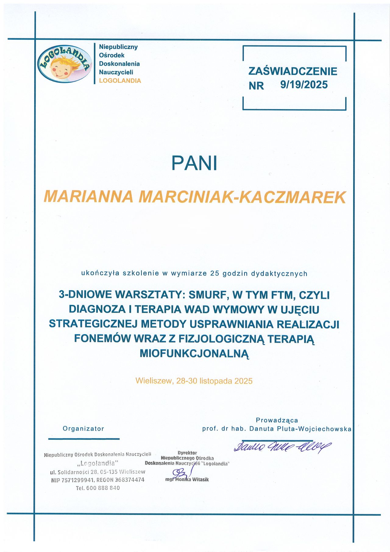 Specjalistka w dziedzinie logopedii i neurologopedii — wspiera zarówno dzieci, jak i dorosłych w poprawie mowy, oddychania oraz funkcjonowania aparatu mięśniowo-twarzowego.