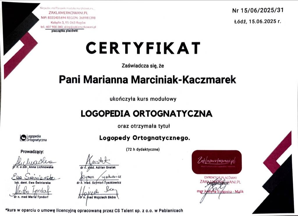 Współpracy interdyscyplinarnej, jeśli wymaga tego sytuacja — m.in. z ortodontą, fizjoterapeutą, laryngologiem czy terapeutą integracji sensorycznej, aby leczenie było pełne i skuteczne.