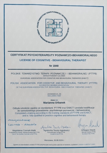 Pani Marianna jest osobą empatyczną przy której można poczuć się komfortowo już na pierwszej wizycie. Podczas naszych spotkań odczuwam, że Pani Urbanek jest szczerze zainteresowana moimi problemami i chce mi pomóc, chce mnie zaopiekować. Panująca w gabinecie atmosfera pomaga mi się szybko otworzyć i opowiedzieć o kwestiach dla mnie trudnych. Po każdej wizycie odczuwam dużą ulgę i krok po kroku zaczynam rozumieć, że mam kontrolę nad tym jak będzie wyglądało moje życie. I że może jeszcze być szczęśliwe. Profesjonalizm i życzliwość Pani Marianny jest nieoceniona, a czas spędzony w gabinecie wyjątkowy i warty każdych pieniędzy. O takich osobach mówi się że mają powołanie do swojego zawodu. Jestem niezmiernie wdzięczna za wsparcie jakie otrzymuję podczas naszych sesji, za trafne zdiagnozowanie moim problemów oraz proponowanie skutecznych rozwiązań.