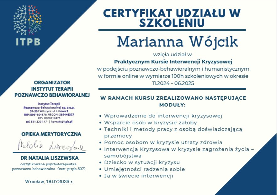 Od początku czułam się bardzo zaopiekowana i wysłuchana. Pani Marianna jest bardzo ciepłą i empatyczną osobą, dzięki czemu podczas sesji czułam się komfortowo i bezpiecznie.