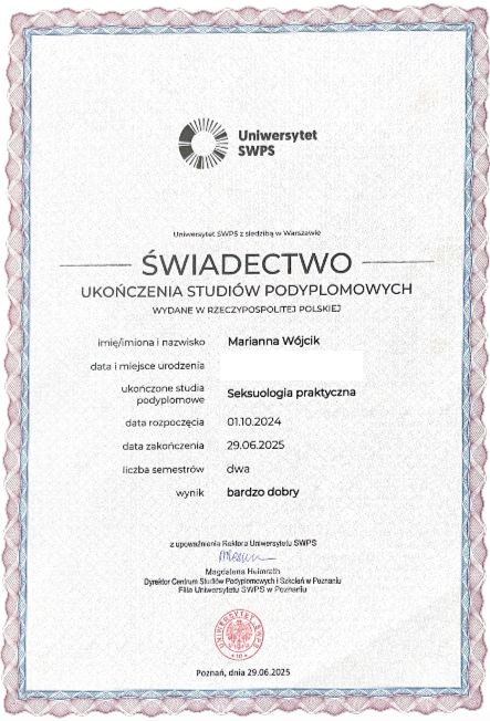 Ukończyłam psychologię na Uniwersytecie SWPS w Warszawie oraz seksuologię na Uniwersytecie SWPS w Poznaniu. Obecnie uczestniczę w czteroletnim szkoleniu przygotowującym do uzyskania certyfikatu psychoterapeuty poznawczo-behawioralnego, rekomendowanym przez Polskie Towarzystwo Terapii Poznawczej i Behawioralnej. Swoje kompetencje poszerzyłam również o kurs Interwencji Kryzysowej w Instytucie Terapii Poznawczo-Behawioralnej we Wrocławiu.