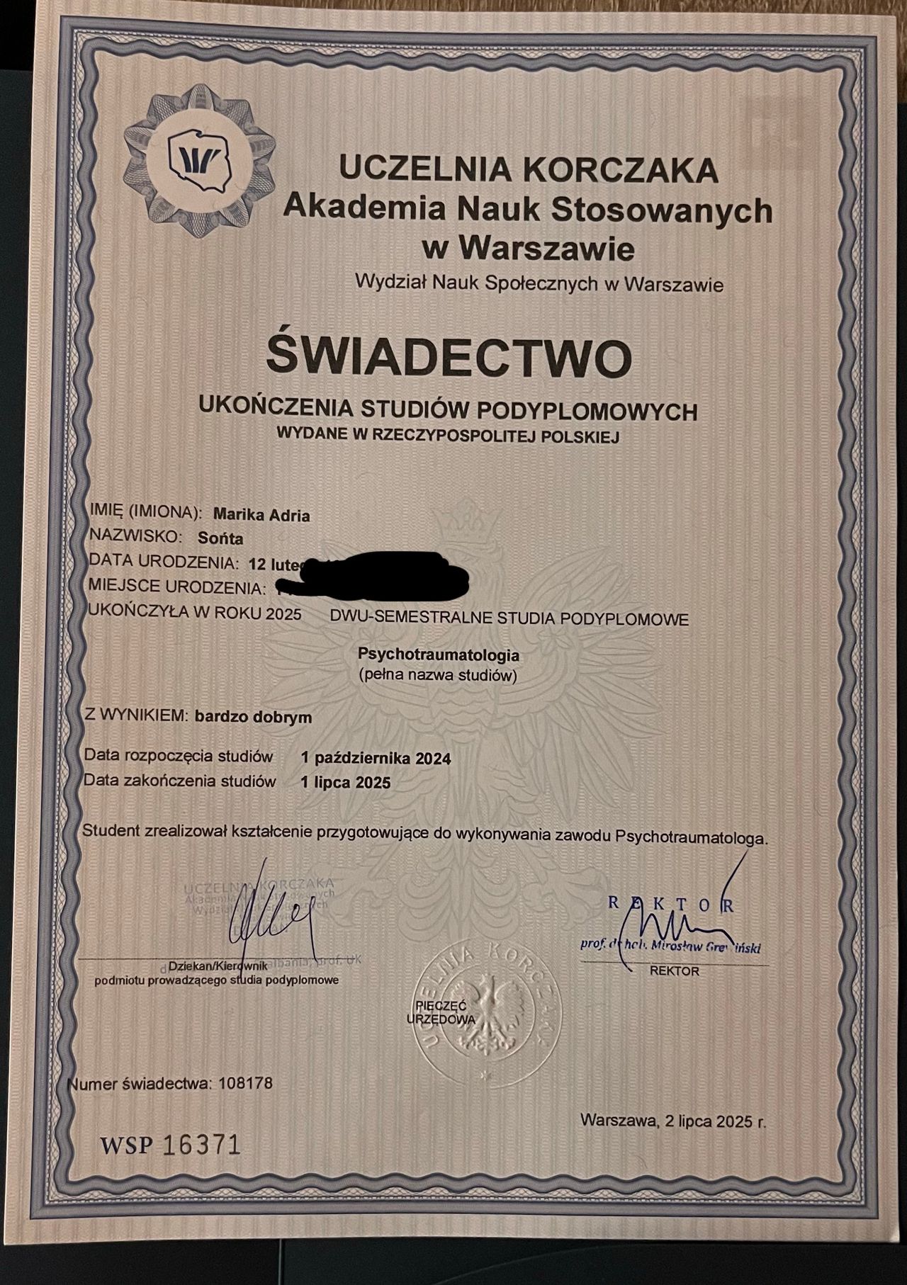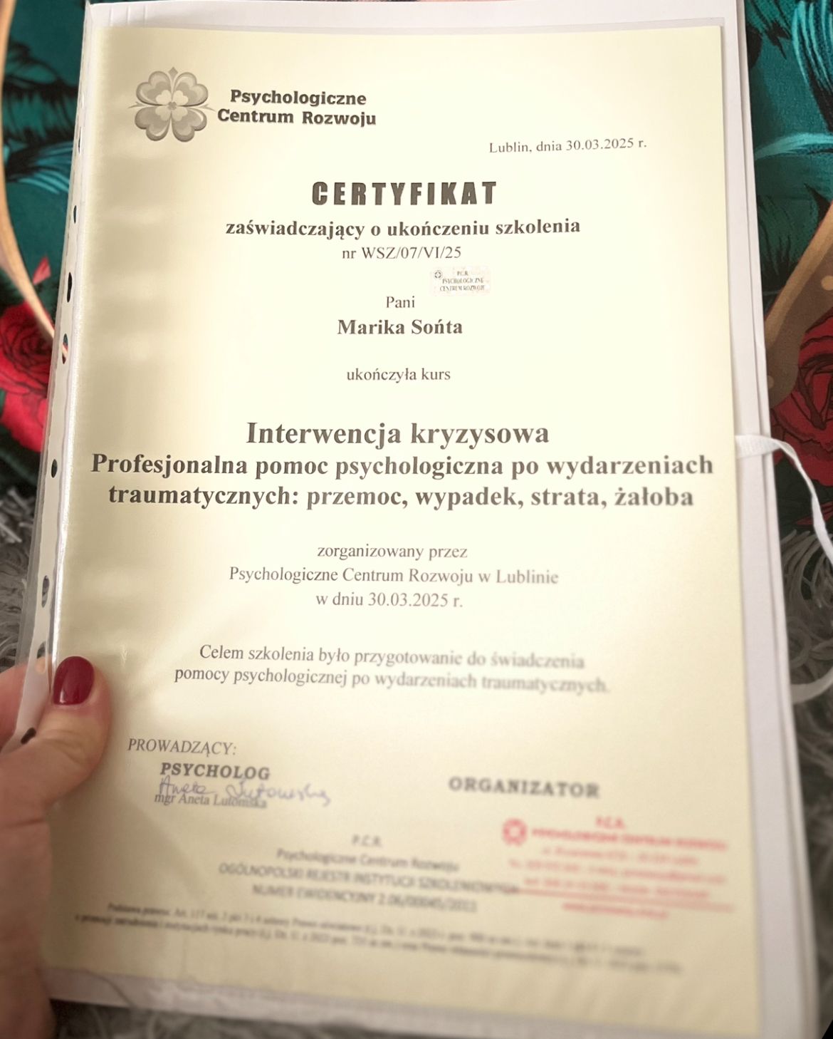 Pani Marika Sońta jest ciepłą i kompetentną osobą. Podczas spotkań nie ocenia i tworzy atmosferę bezpieczeństwa, w której łatwo się otworzyć. W jasny sposób tłumaczy poruszane zagadnienia, co pomaga lepiej je zrozumieć. Zawsze mogę liczyć na oczekiwaną pomoc i wsparcie.