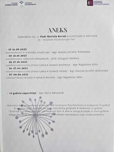 posiadaczką Europejskiego Certyfikatu Psychoterapeuty (ECP)