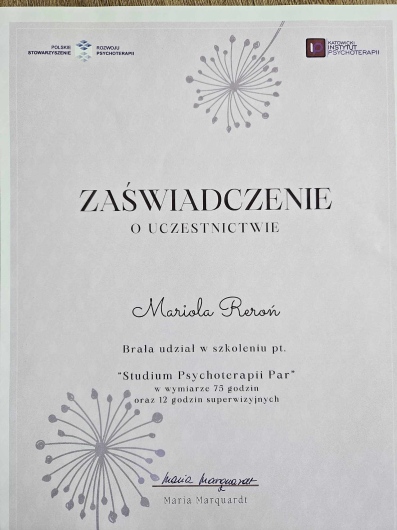 Nazywam się Mariola Reroń. Jestem certyfikowaną psychoterapeutką z wieloletnim doświadczeniem w pracy z dziećmi, młodzieżą, dorosłymi, parami oraz rodzinami. Pomagam osobom w różnym wieku lepiej radzić sobie z emocjami, stresem, trudnościami w relacjach i życiowymi kryzysami.