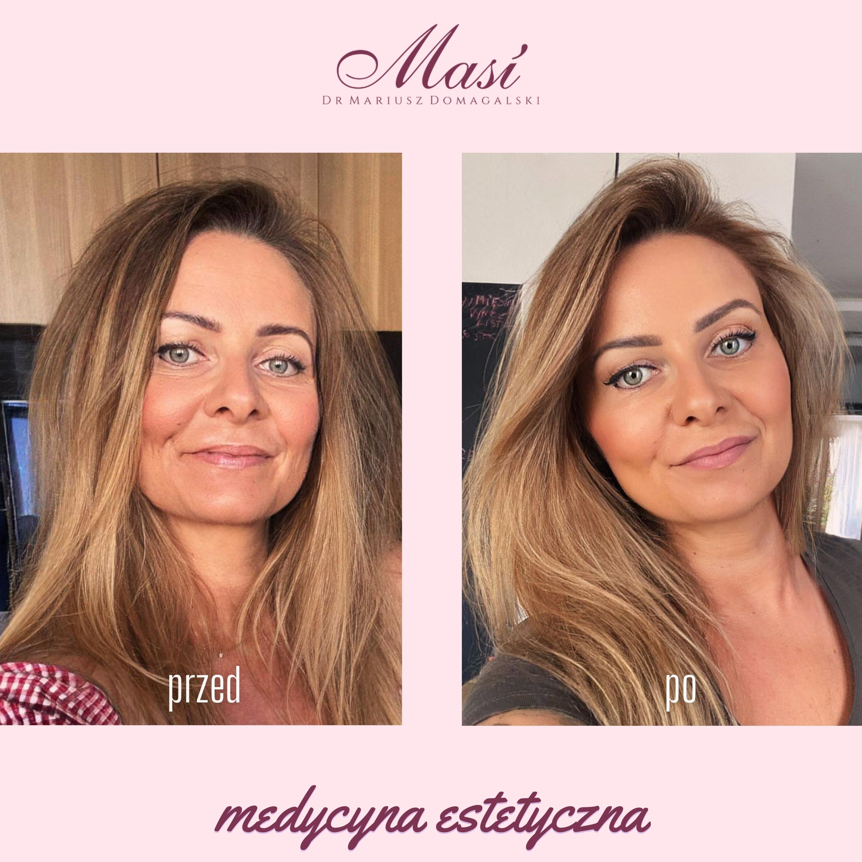 "Moja mala metamorfoza. Zdjecie nr 1, czolo oraz okolica oka zmeczone. Zdjecie nr 2, miesiac po wizycie u @masi_szczecin doktora Mariusza, dziekuje raz jeszcze za odswiezenie mojego spojrzenia oraz za cierpliwosc... Oba zdjecia sa prawdziwe, bez fotoszopa"