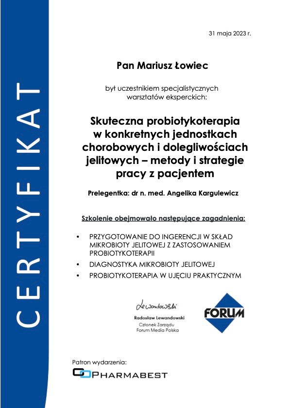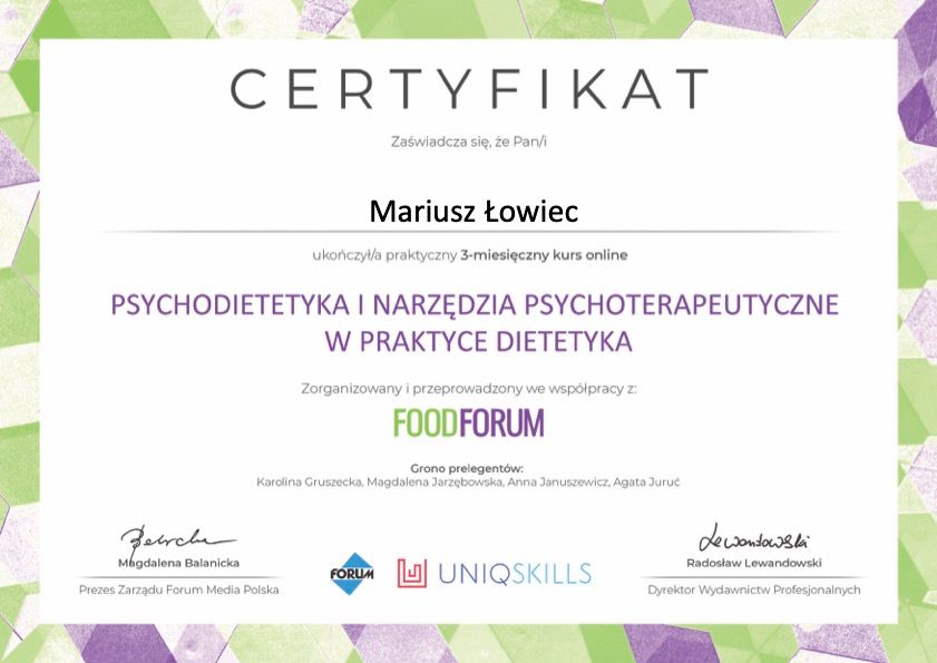 Nazywam się Mariusz Łowiec i jestem magistrem dietetyki klinicznej oraz pasjonatem pomagania ludziom w osiąganiu ich celów zdrowotnych i żywieniowych. Moja misja to przekazywanie wiedzy i wspieranie w drodze do lepszego samopoczucia, zdrowia i witalności. Pozwól, że przedstawię Ci swoją drogę zawodową i pasje, które składają się na unikalne podejście do dietetyki, której się oddaję.
