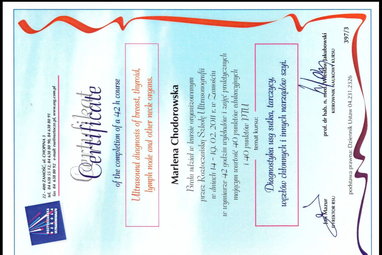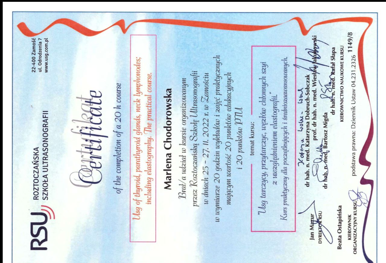 Ukończyłam kurs USG tarczycy organizowany przez Roztoczańską Szkołę Ultrasonografii, który objęty jest nadzorem merytorycznym Polskiego Towarzystwa Ultrasonograficznego.