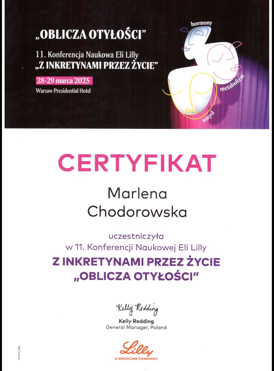 Regularnie uczestniczę w szkoleniach specjalistycznych z zakresu endokrynologii, diabetologii i obesitologii.