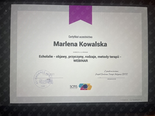 Pani Marlena szybko nawiązała bardzo dobry kontakt z córką. Spotkania i rozmowy z nią są nieocenionym wsparciem nie tylko dla dziecka ale także dla mnie. Jej empatia, wiedza i umiejętności pomagają córce w zrozumieniu i radzeniu sobie z trudnościami, otwierając drogę do pozytywnych zmian. Dzięki jej profesjonalizmowi i zaangażowaniu córka bardzo chętnie uczestniczy w zajęciach.