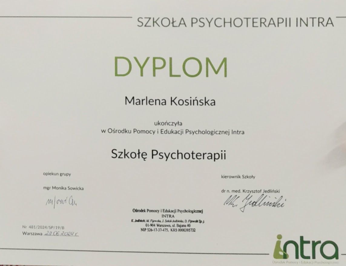 Jestem psycholożką i psychoterapeutką humanistyczno-doświadczeniową w procesie certyfikacji. Ukończyłam czteroletnie szkolenie psychoterapeutyczne w rekomendowanym przez Polskie Towarzystwo Psychologiczne Ośrodku Pomocy i Edukacji Psychologicznej INTRA.