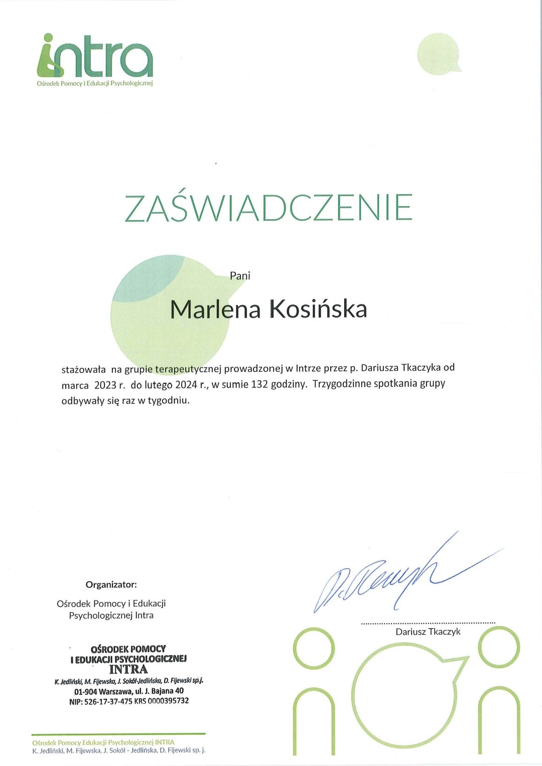 Swoją pracę poddaję regularnej superwizji, dbając o wysoki standard i bezpieczeństwo procesu terapeutycznego.
