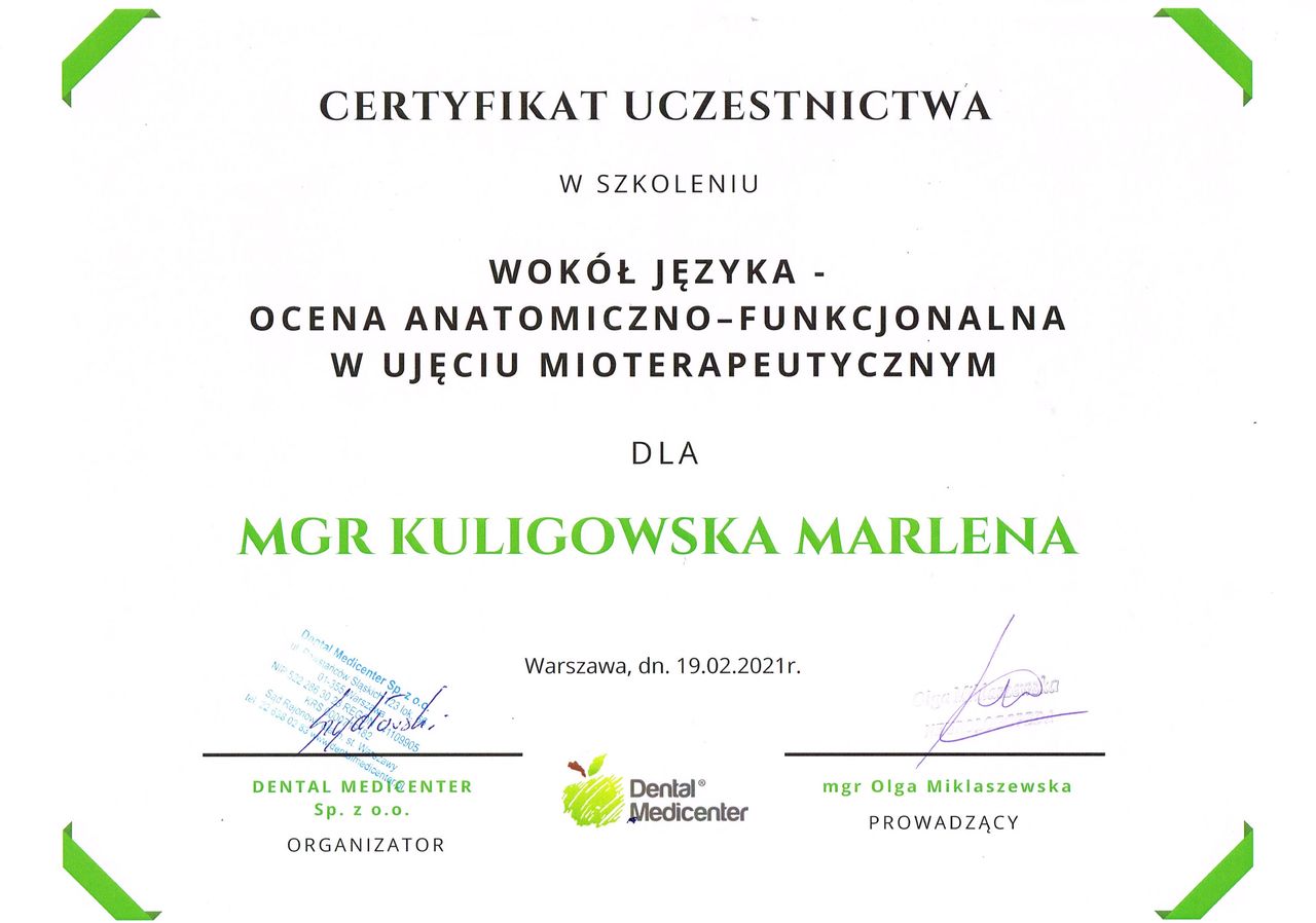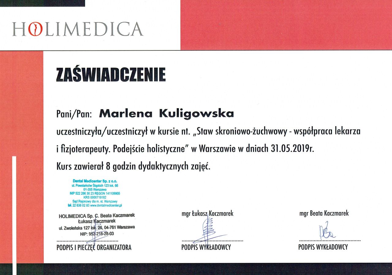 Jaki jest zakres porad oferowanych przez Marlena Kuligowska?Marlena Kuligowska to fizjoterapeuta. Na podstawie swojego doświadczenia i wykształcenia Marlena Kuligowska oferuje usługi takie jak: konsultacja fizjoterapeutyczna, Terapia manualna, taping (plastrowanie), fizjoterapia, konsultacja bruksizmu, fizjoterapia stomatologiczna, Fizjoterapia stomatologiczna (kolejna wizyta).