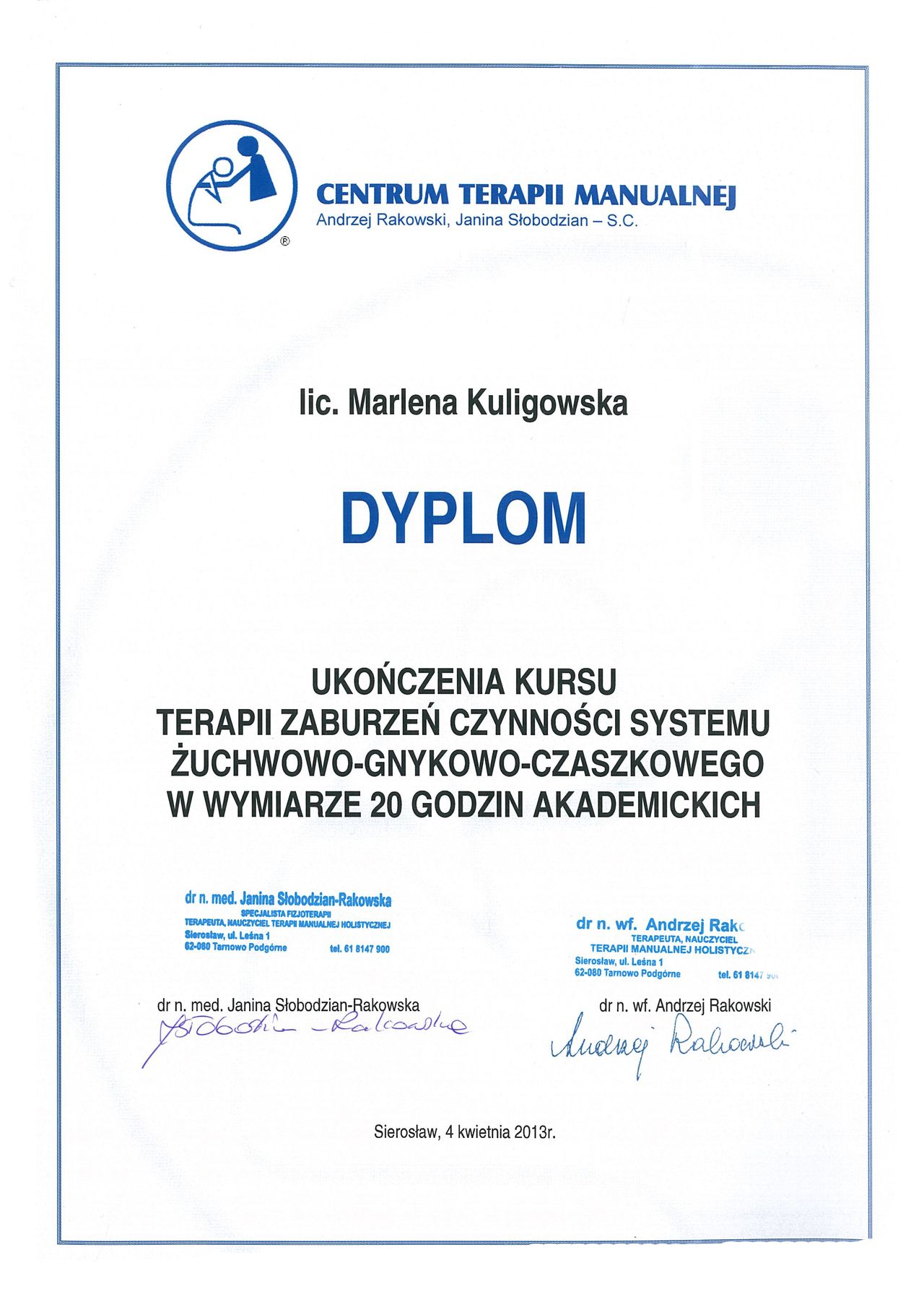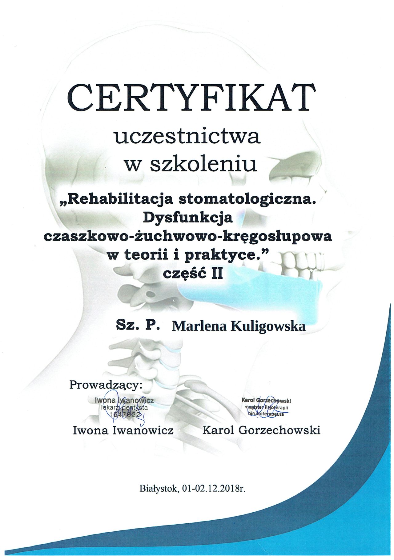 Trafiłam do Pani Marleny z ogromnym bólem stawu skroniowo-żuchwowego.Dzięki profesjonalnemu podejściu i ogromnej empatii już po pierwszej wizycie poczułam dużą ulgę. Po wizycie dostałam wskazówki do wykonywania ćwiczeń w domu. Gorąco polecam Panią Marlenę.