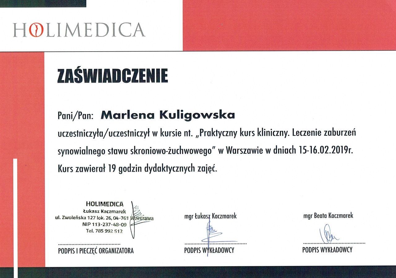 Profesjonalna, miła i kontaktowa. Do pani Marleny trafiłem z bólami głowy i problemami ze stawem skroniowo-żuchwowym. Kompleksowo podeszła do mojego problemu, wszystko jasno wyjaśniła, na koniec wizyty otrzymałem wskazówki do ćwiczeń w domu.