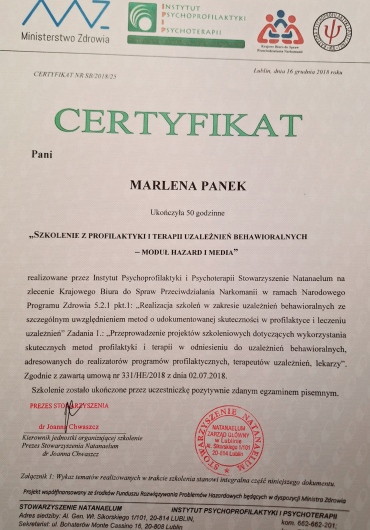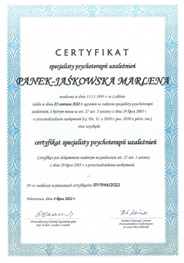 • Psychoterapią osób uzależnionych oraz wsparciem osób doświadczających trudności w związku z uzależnieniem bliskiej osoby