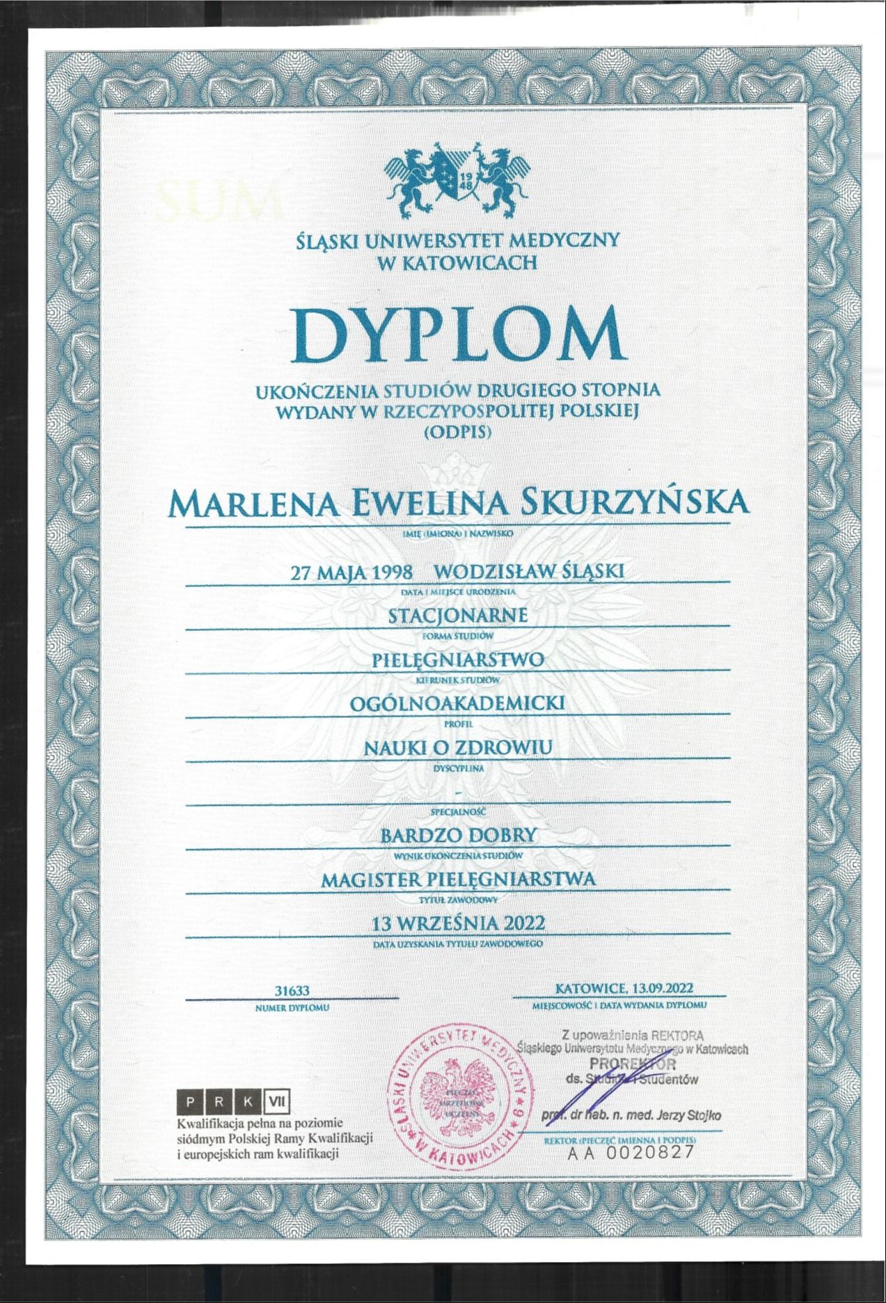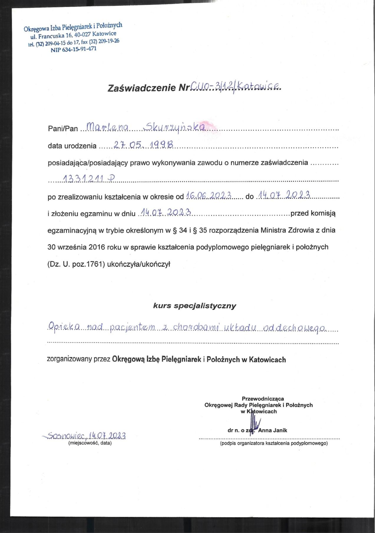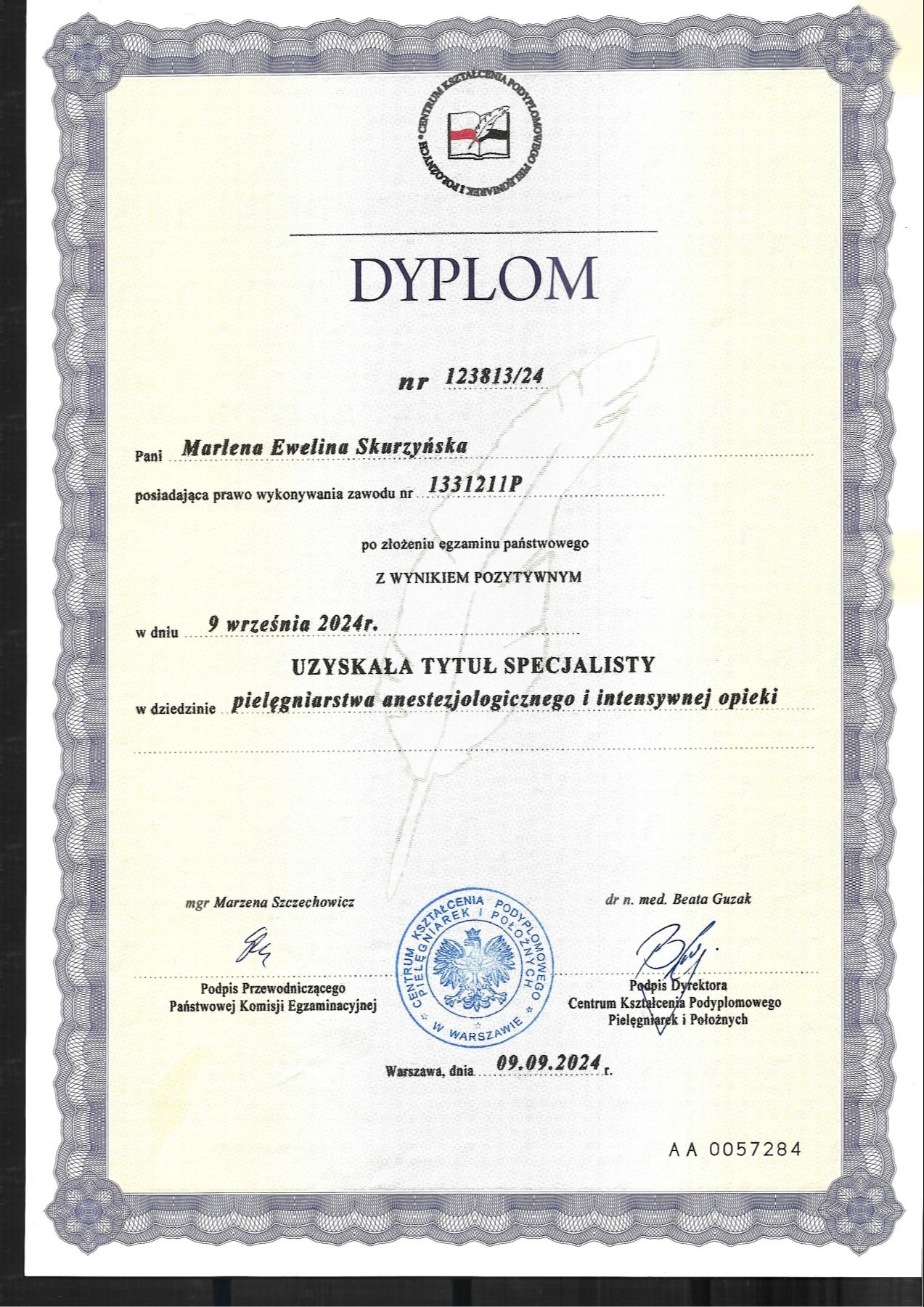 MAGISTER PIELĘGNIARSTWA, SPECJALISTKA PIELĘGNIARSTWA ANESTEZJOLOGICZNEGO I INTENSYWNEJ OPIEKI; SPECJALISTKA Z ZAKRESU LECZENIA RAN ORAZ OPIEKI NAD PACJENTEM WENTYLOWANYM MECHANICZNIE