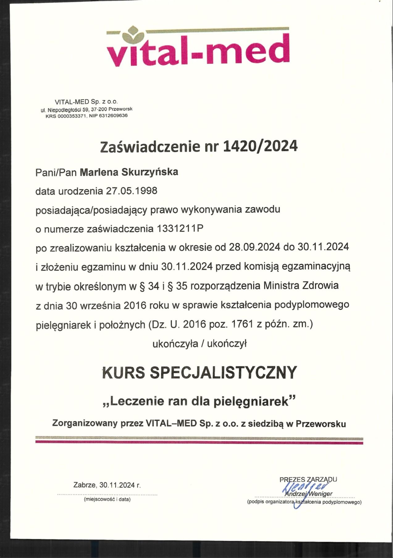 Nazywam się Marlena Skurzyńska, ukończyłam studia magisterskie na kierunku pielęgniarstwo na Śląskim Uniwersytecie Medycznym w Katowicach. W 2024 roku ukończyłam także specjalizację z zakresu anestezjologii i intensywnej terapii. Posiadam także liczne kursy uzupełniające moje wykształcenie, m.in. Advanced Life Support (ALS) - Medycyny Praktycznej w Krakowie, kurs specjalistyczny z zakresu leczenia ran, kurs specjalistyczny z zakresu opieki nad pacjentem wentylowanym mechanicznie, kurs leczenia ran techniką podciśnieniową (NPWT) oraz kompresjoterapii w leczeniu owrzodzeń kończyn dolnych (ukończone w jednej z najlepszych klinik leczenia ran w Polsce - PODOS w Warszawie), kurs z roli żywienia w procesie gojenia ran, kurs z zakresu terapii blizn oraz zabiegów autologicznych i wiele innych.