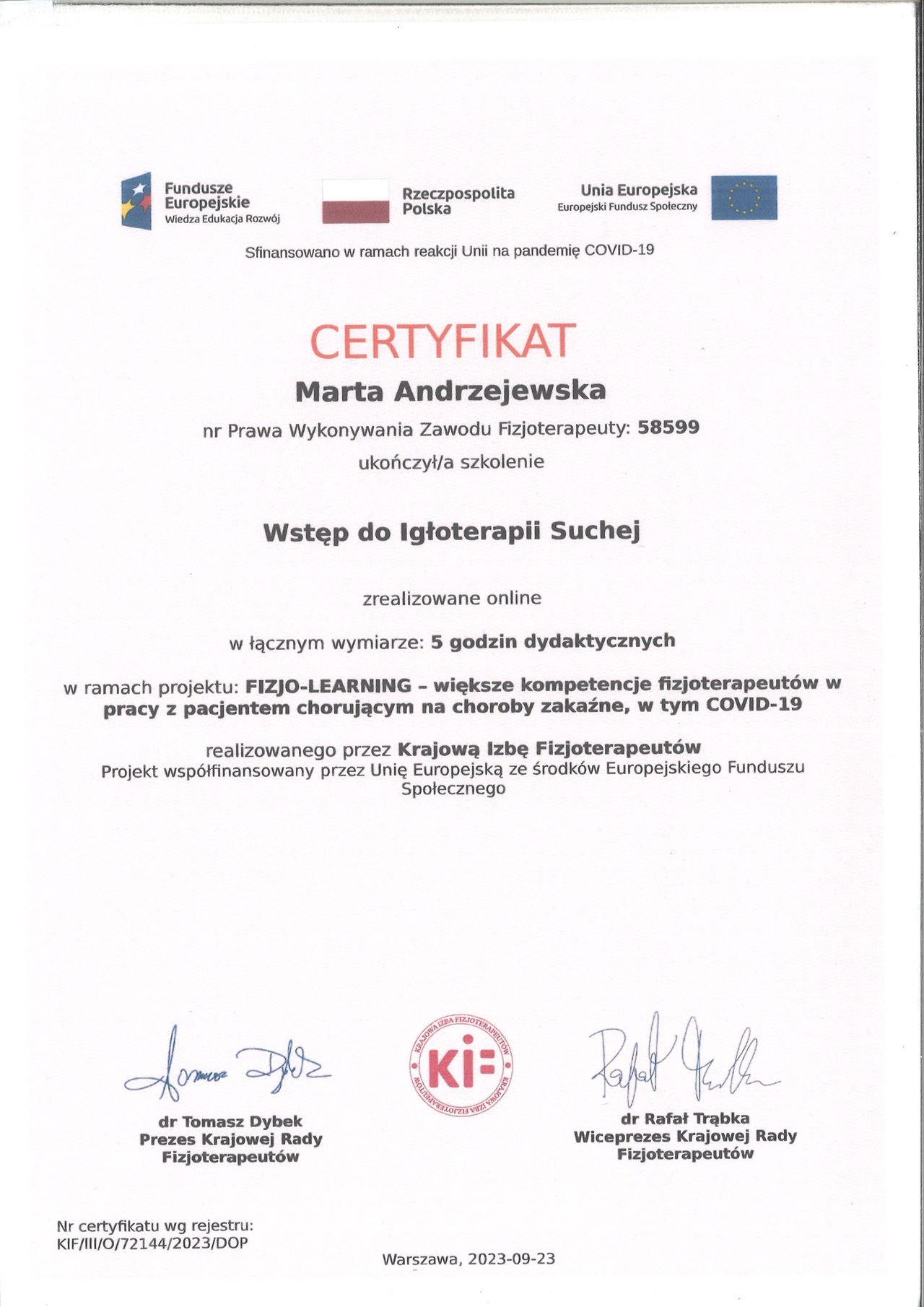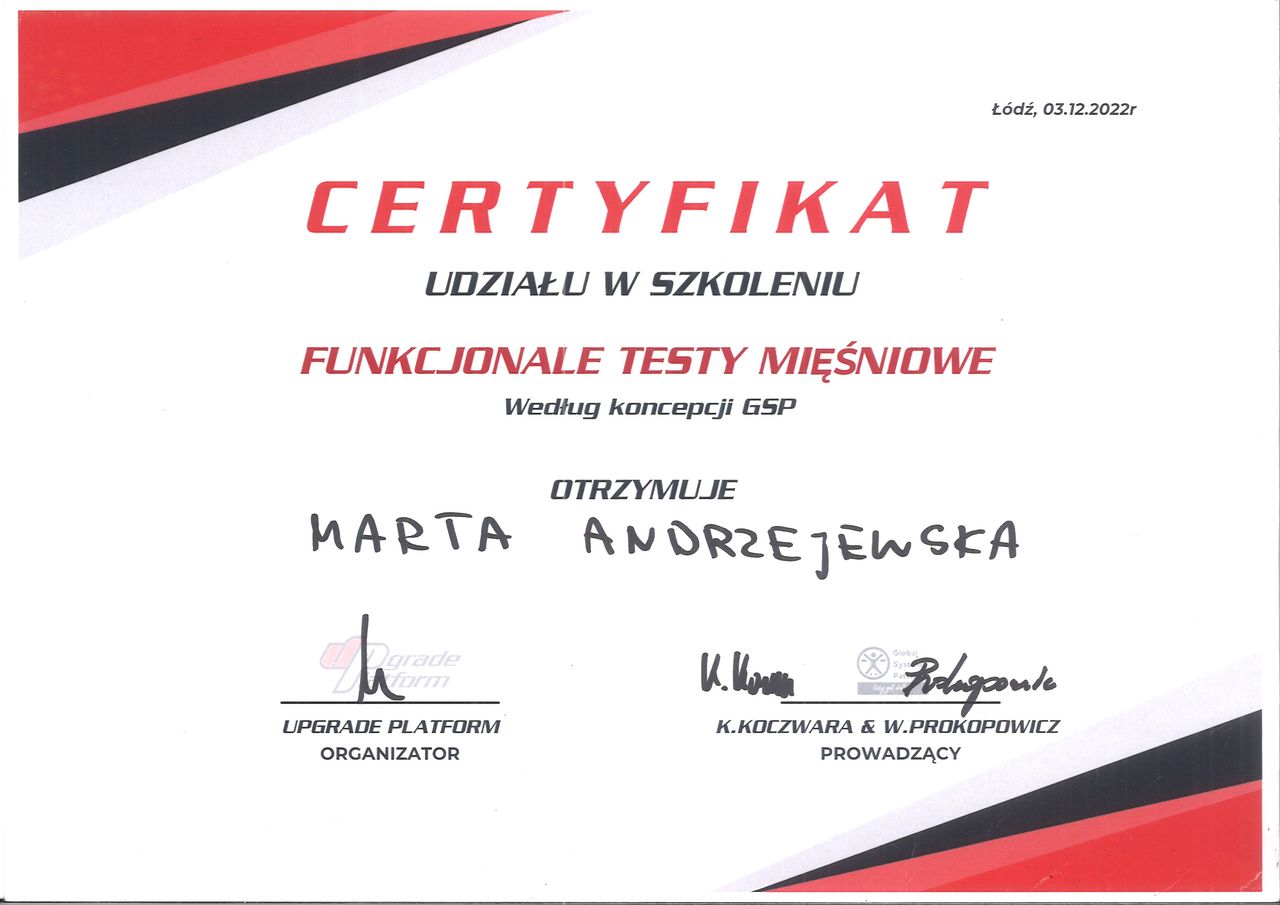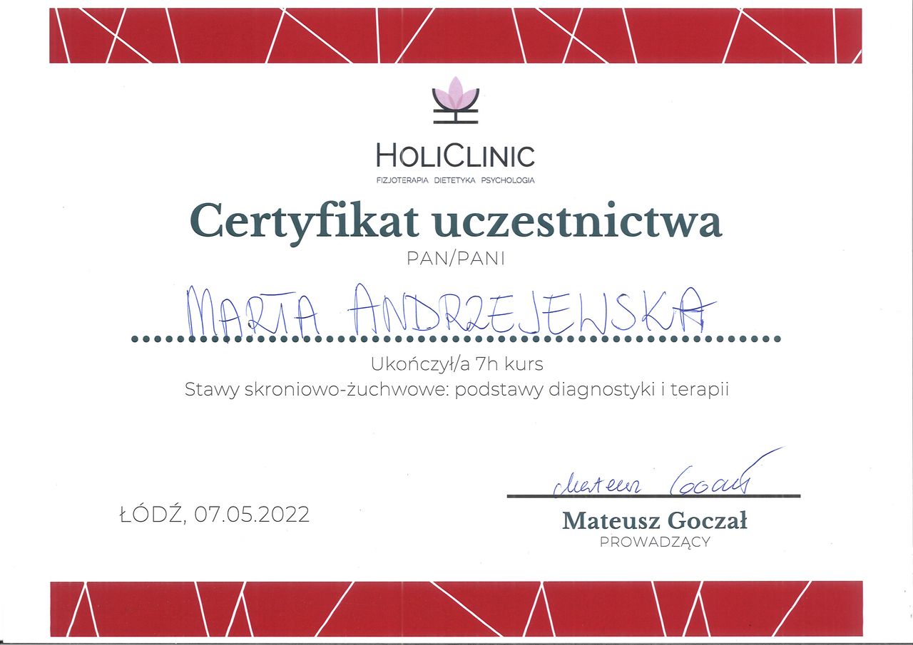 Jaki jest zakres porad oferowanych przez Marta Andrzejewska?Marta Andrzejewska to fizjoterapeuta. Na podstawie swojego doświadczenia i wykształcenia Marta Andrzejewska oferuje usługi takie jak: Terapia tkanek miękkich, Terapia manualna, terapia mięśniowo-powięziowa, ćwiczenia korekcyjne, Hirudoterapia, Refleksoterapia, Drenaż Limfatyczny Manualny, konsultacja fizjoterapeutyczna, rehabilitacja, Terapia bólu.