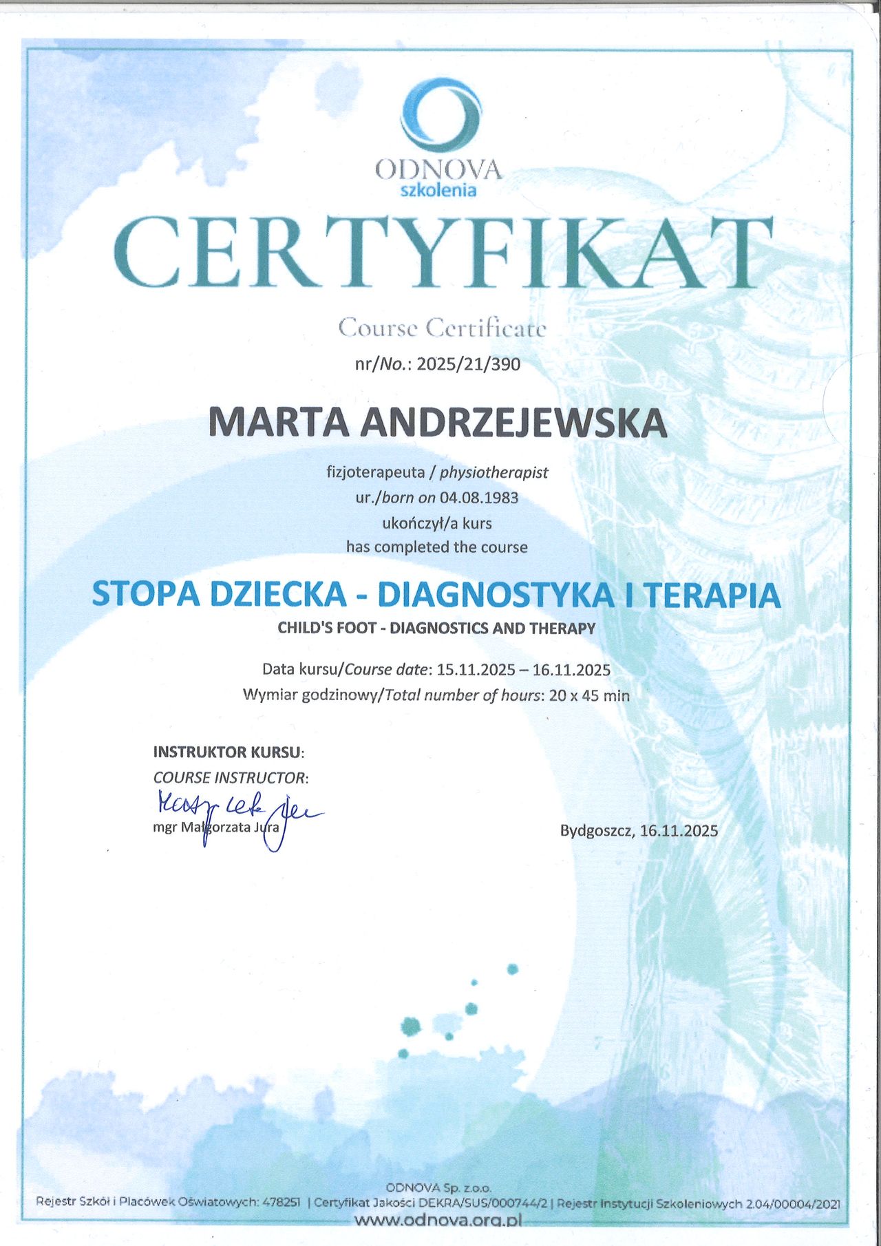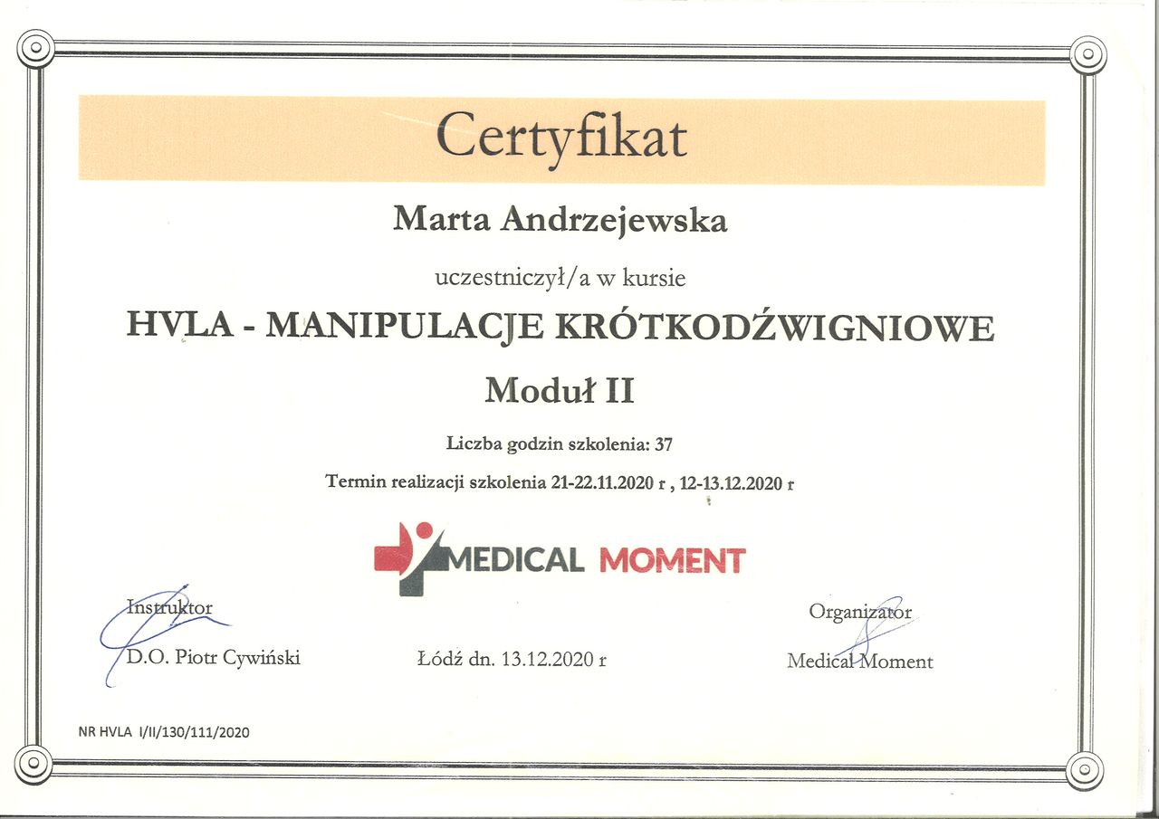 Pracuję w zawodzie fizjoterapeuty od 2007 r, w między czasie uzupełniłam wiedzę o studia licencjackie z zakresu psychologii o profilu rozwój osobowości. Z pełną satysfakcją pełnię misję jaką jest pomaganie pacjentom w dolegliwościach narządu ruchu. Swój warsztat uzupełniłam jeszcze o szereg szkoleń dodatkowych takimi jak refleksoterapia oraz hirudoterapia (pijawki lekarskie). Moje dodatkowe specjalizacje to m.in:- wady postawy u dzieci, drenaż limfatyczny również w onkologii (kobiety po operacji oszczędzającej pierś lub pełnej mastektomii), terapia tkanek miękkich, terapia trzewna i wiele innych.