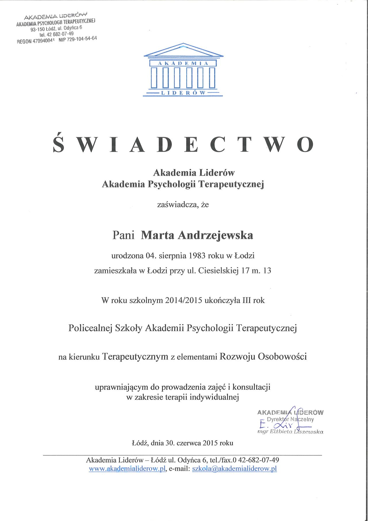 Gdzie Marta Andrzejewska ma swój gabinet?Marta Andrzejewska przyjmuje pod adresem:
