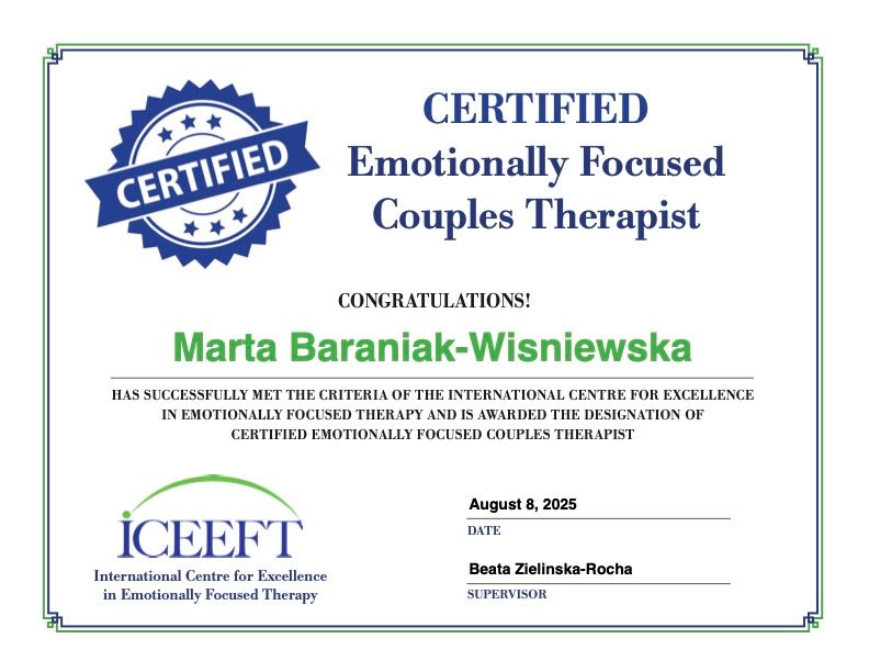 Pani Marta tworzy w gabinecie atmosferę bezpiecznej przestrzeni, w której bez obaw można mówić o tym co najtrudniejsze. Zawsze podchodziła do mnie z wielkim zrozumieniem, życzliwością i akceptacją tego co przeżywałam. Nigdy nie czułam się oceniona, co miało dla mnie ogromne znaczenie. Od pierwszego spotkania poczułam, ze jestem z profesjonalną terapeutką, która ma pod kontrolą proces terapeutyczny. Nasze spotkania zaowocowały realną zmianą jakości mojego życia, a także wyposażyły mnie w narzędzia, które teraz pomagają mi żyć tak jak chce i czuć się znowu szczęśliwą. Polecam serdecznie Panią Martę jako terapeutkę z wielkim zaangażowaniem, spokojem i nastawieniem na pomoc pacjentowi.Dzięki pomocy Pani Marty i naszej wspólnej pracy, dziś jestem w innym miejscu w życiu, za co jestem i będę zawsze bardzo wdzięczna. Dziękuję :)
