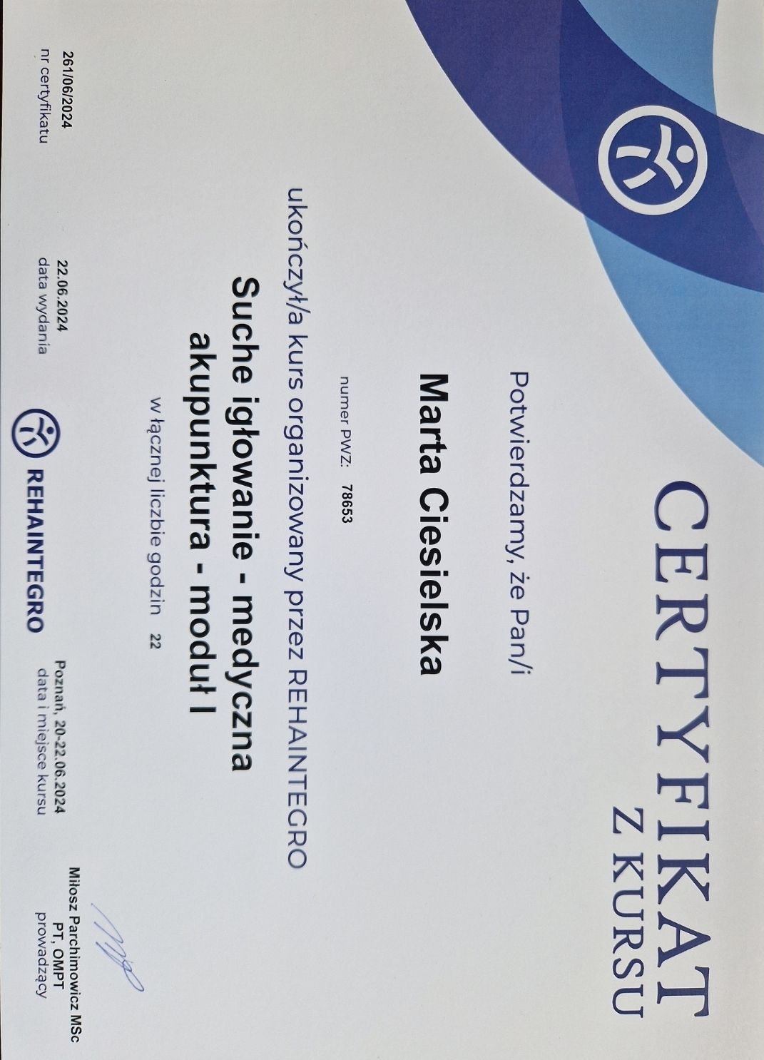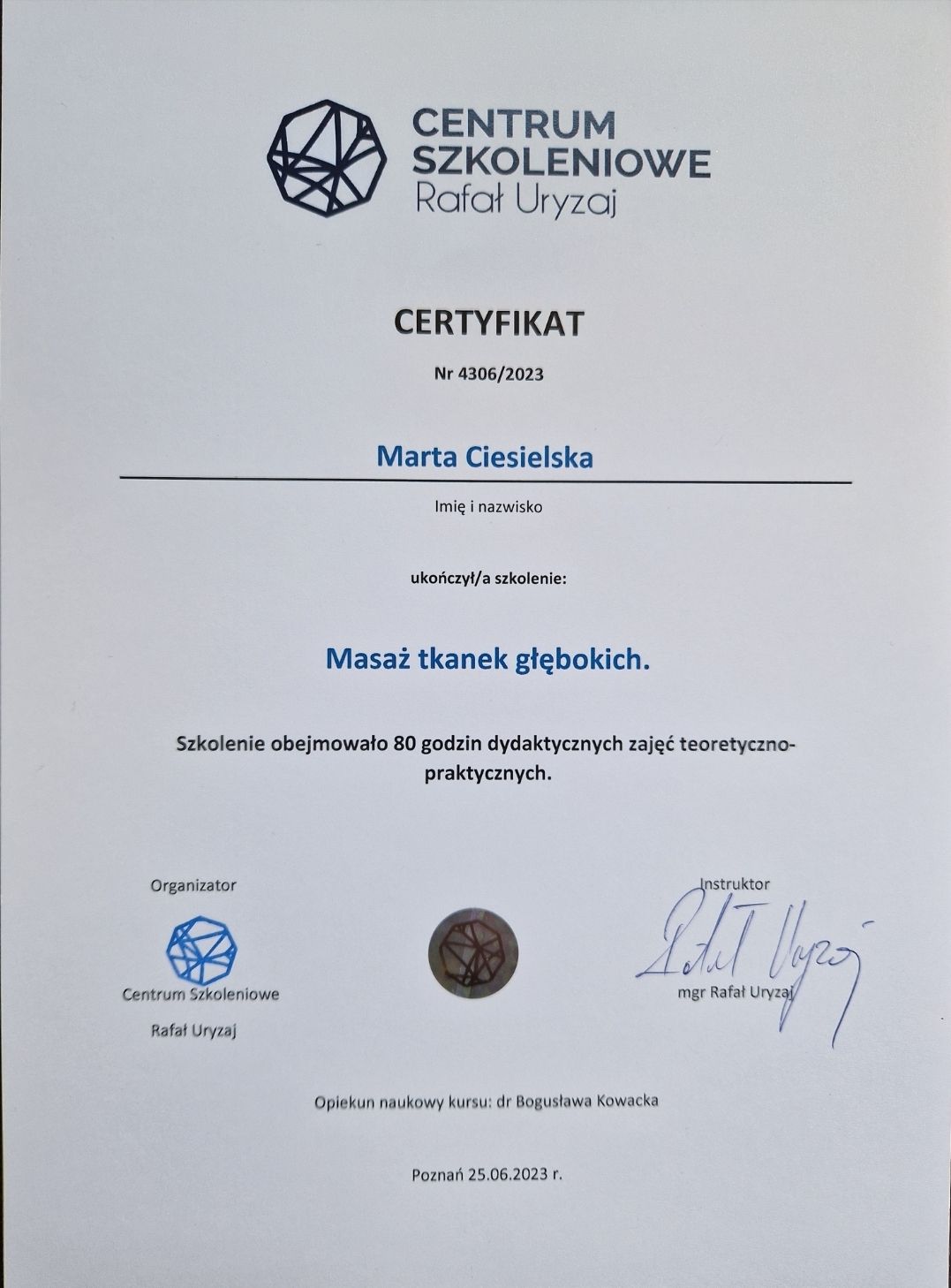 Na co dzień wspieram osoby aktywne fizycznie – w tym zawodowych sportowców – oraz pacjentów powracających do sprawności po urazach, operacjach ortopedycznych i z przewlekłym bólem, np. związanym z siedzącym trybem życia. Doświadczenie zdobywałam w gabinetach prywatnych, podczas wizyt domowych oraz współpracując ze sportowcami, m.in. z zespołem Enea Energetyk Poznań.