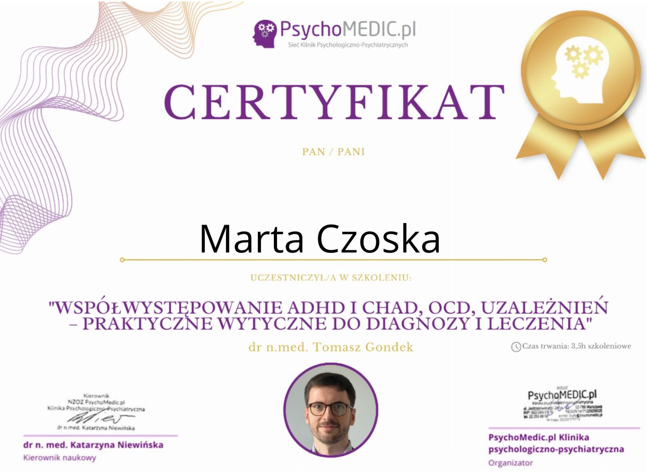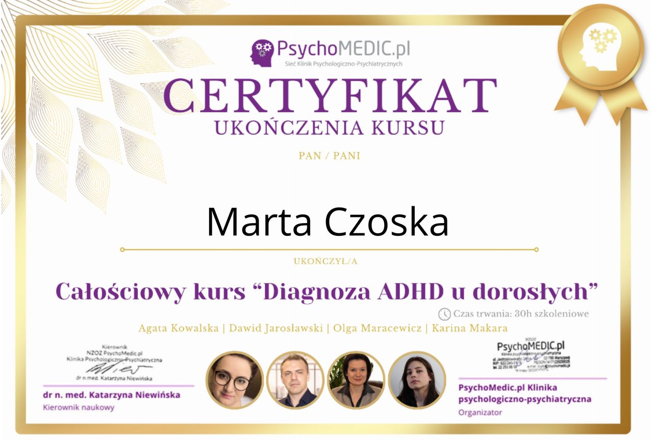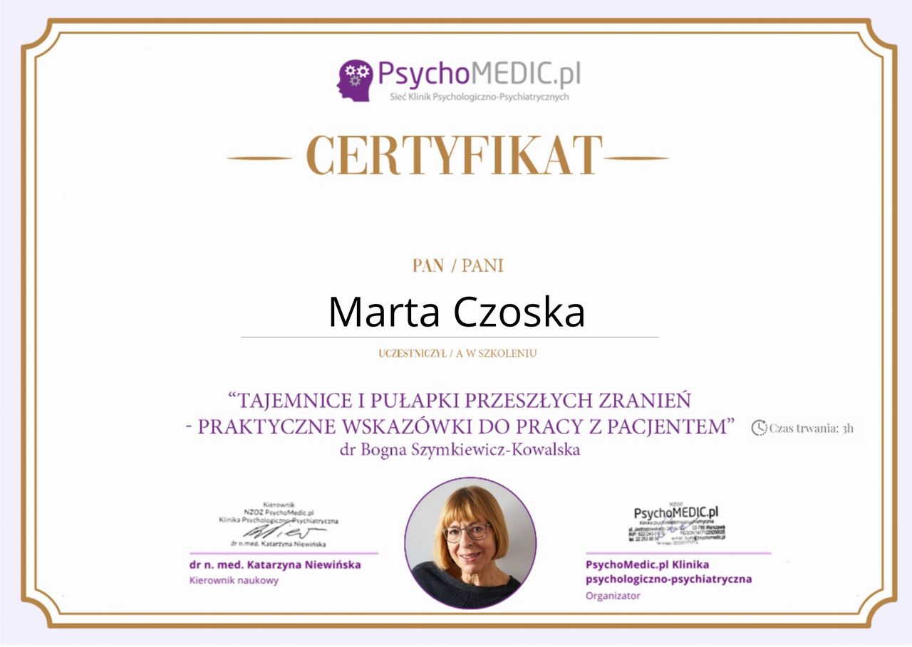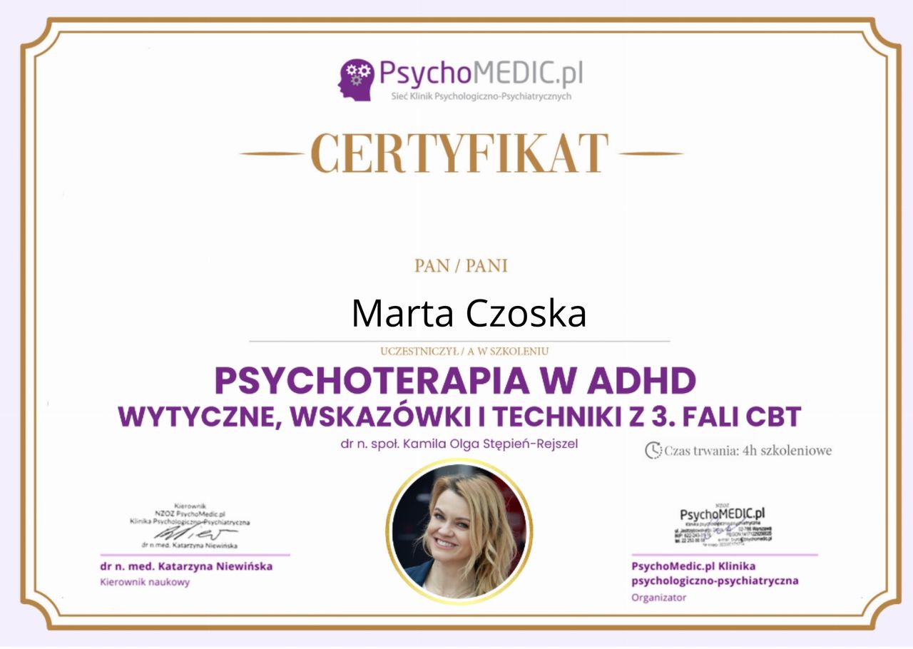 Ukończyłam kurs Terapii Skoncentrowanej na Rozwiązaniach (TSR) I stopnia, kurs diagnozy ADHD, kurs diagnozy zaburzeń osobowości (MMPI-2) oraz wiele innych szkoleń z zakresu psychoterapii, diagnostyki i pracy z osobami neuroróżnorodnymi.