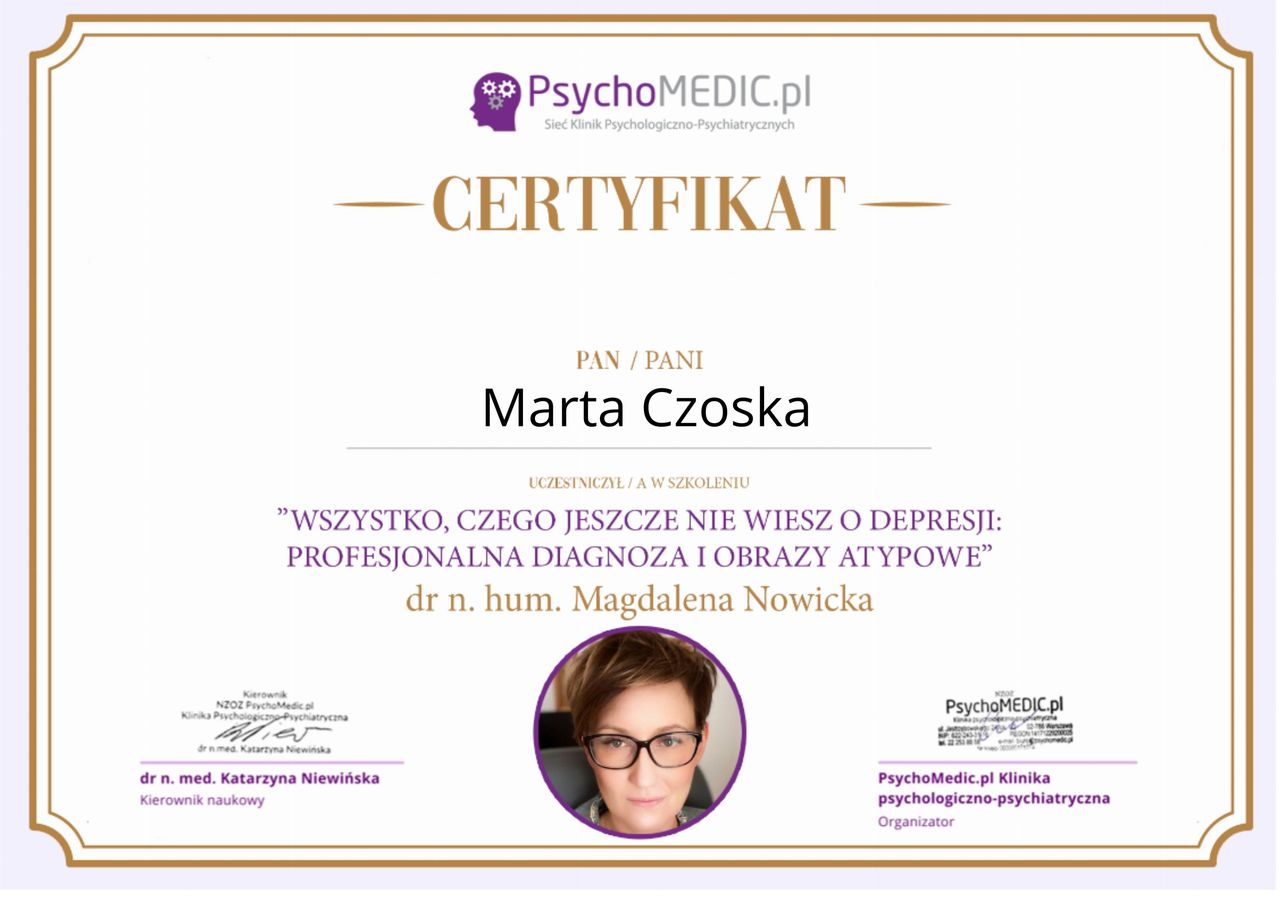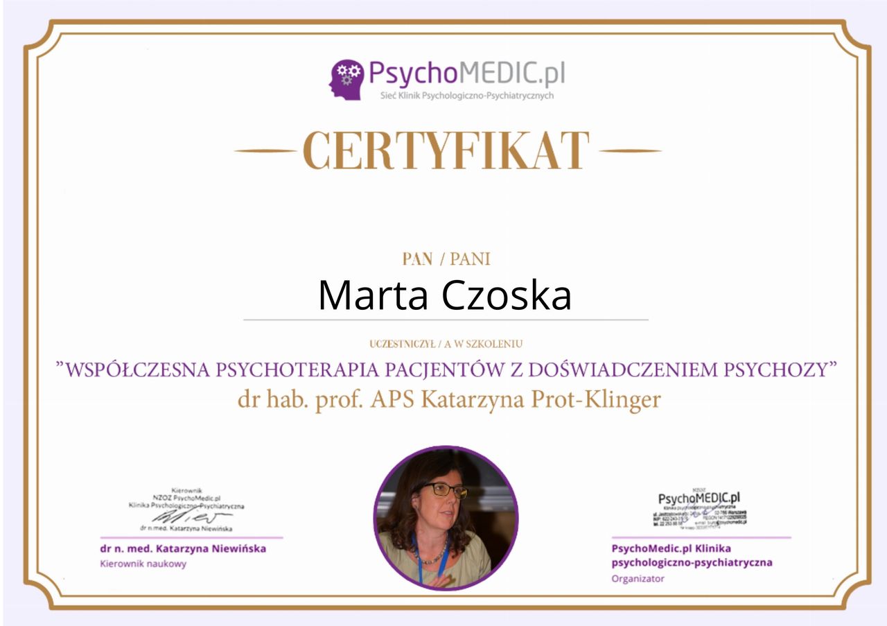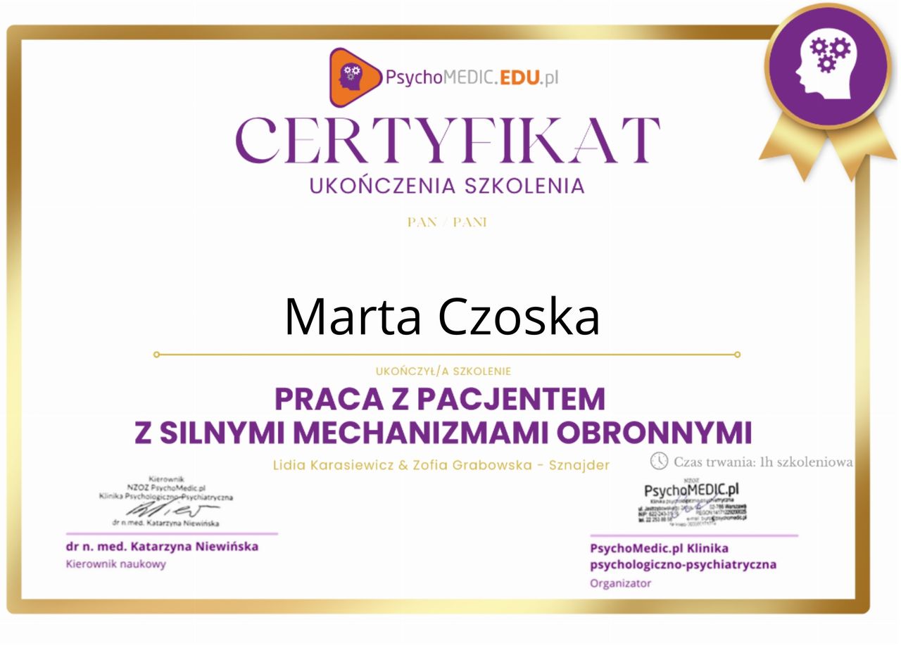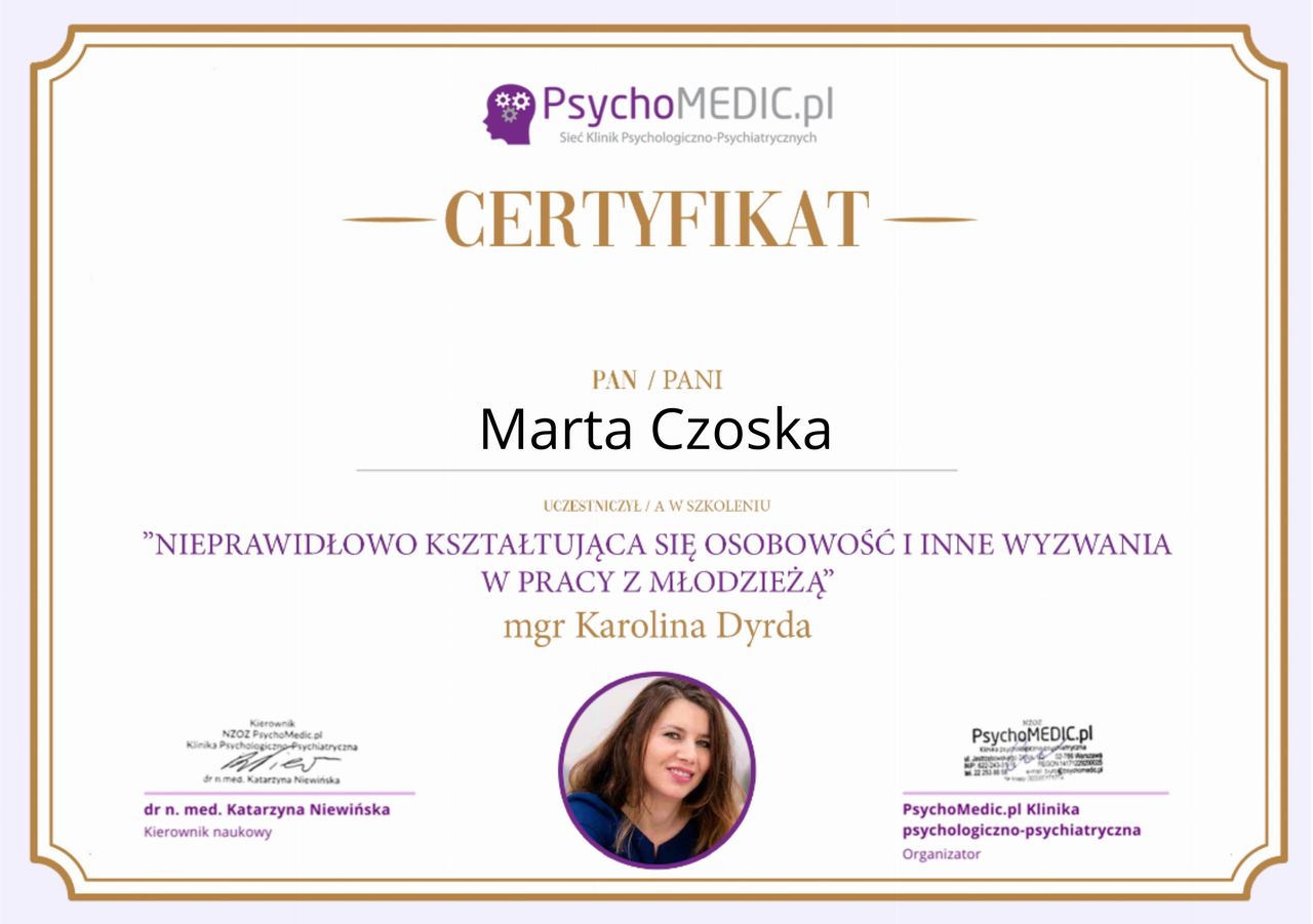 Ukończyłam kurs Terapii Skoncentrowanej na Rozwiązaniach (TSR) I stopnia, kurs diagnozy ADHD, kurs diagnozy zaburzeń osobowości (MMPI-2) oraz wiele innych szkoleń z zakresu psychoterapii, diagnostyki i pracy z osobami neuroróżnorodnymi.