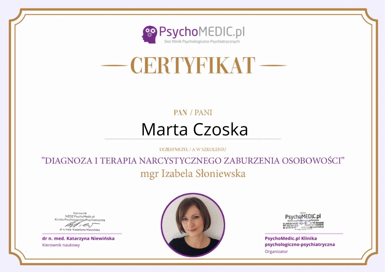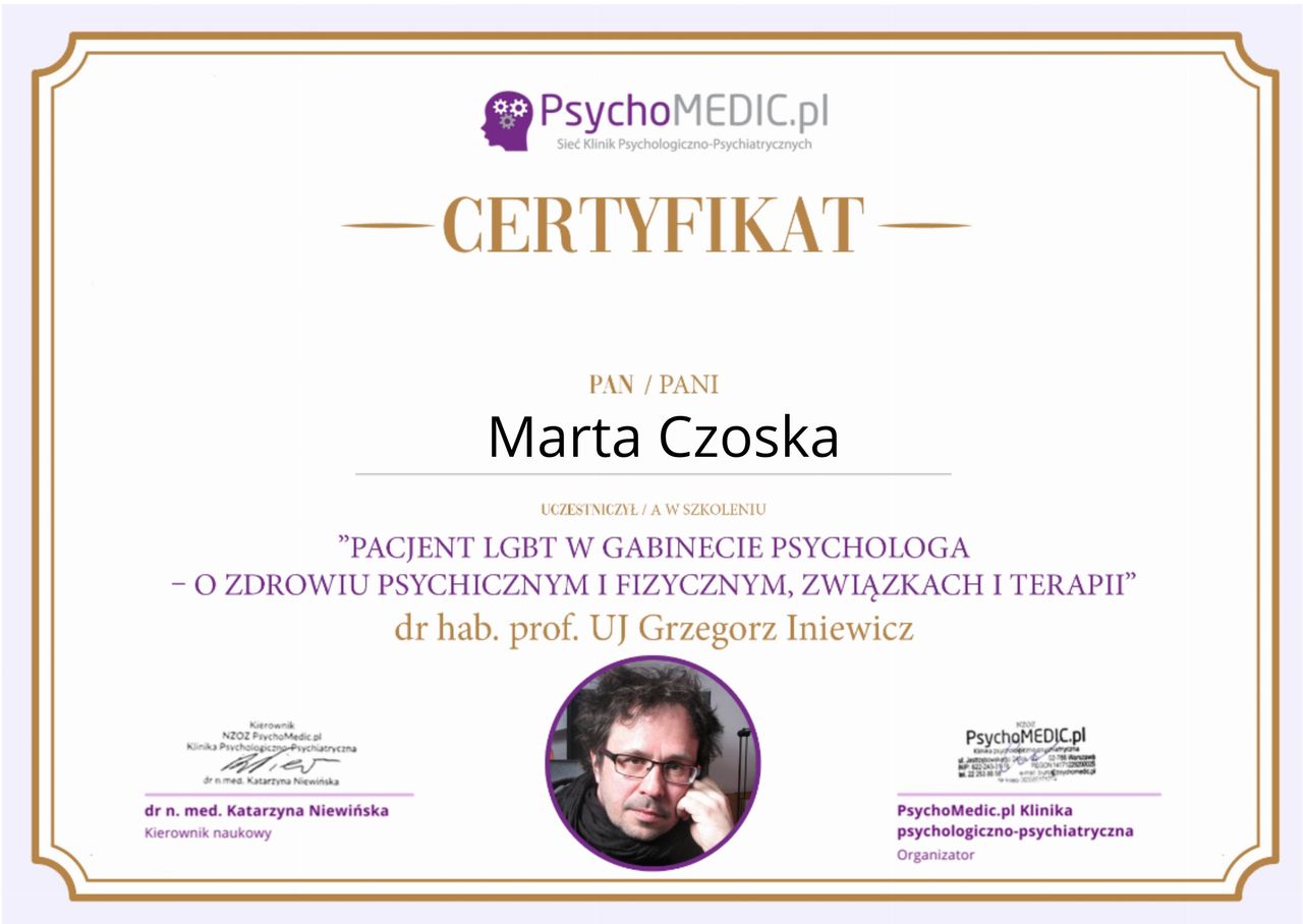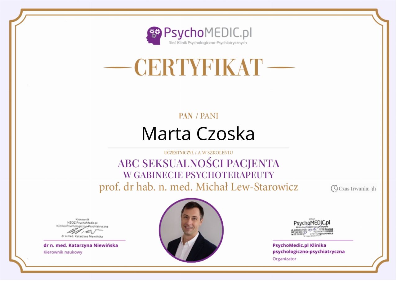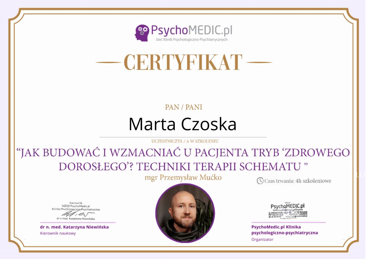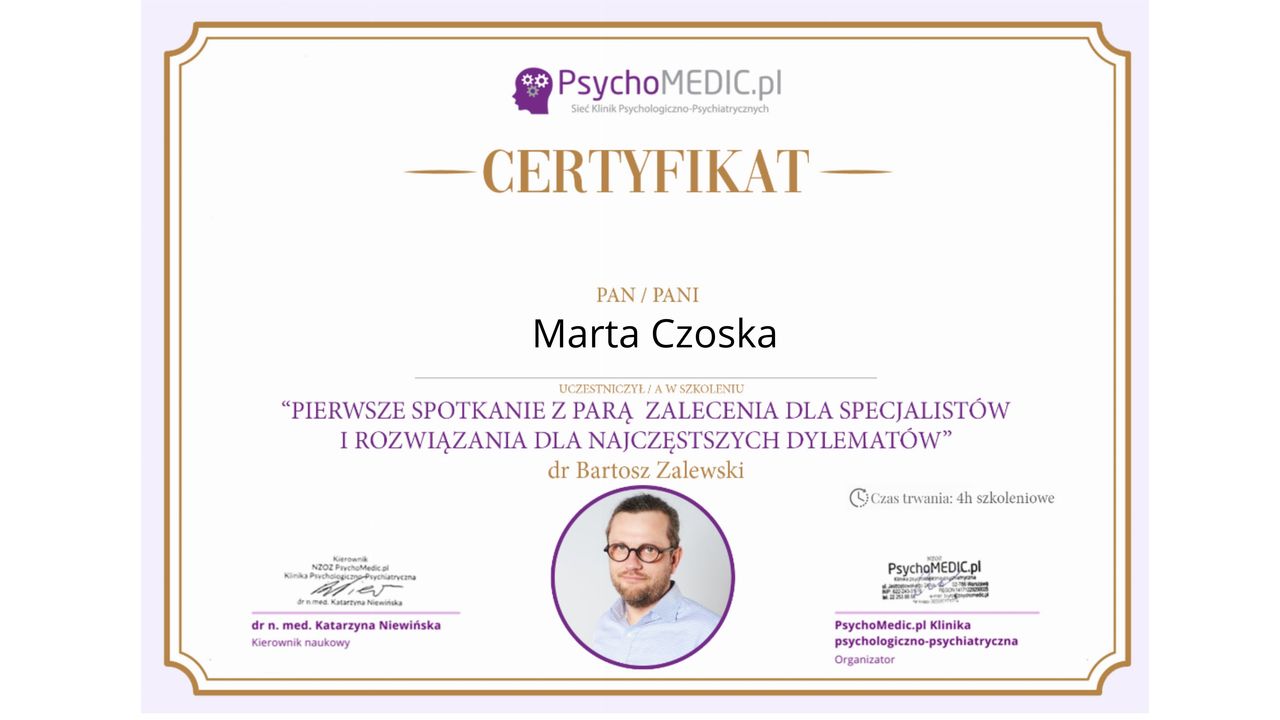 Ukończyłam kurs Terapii Skoncentrowanej na Rozwiązaniach (TSR) I stopnia, kurs diagnozy ADHD, kurs diagnozy zaburzeń osobowości (MMPI-2) oraz wiele innych szkoleń z zakresu psychoterapii, diagnostyki i pracy z osobami neuroróżnorodnymi.