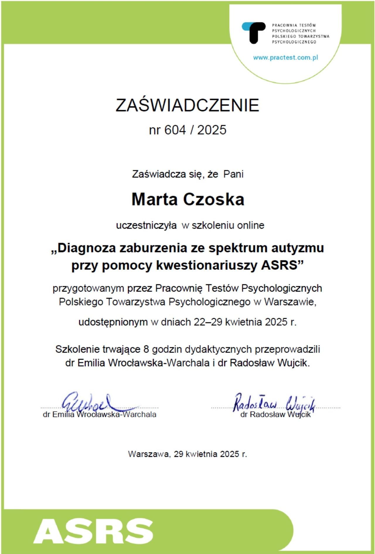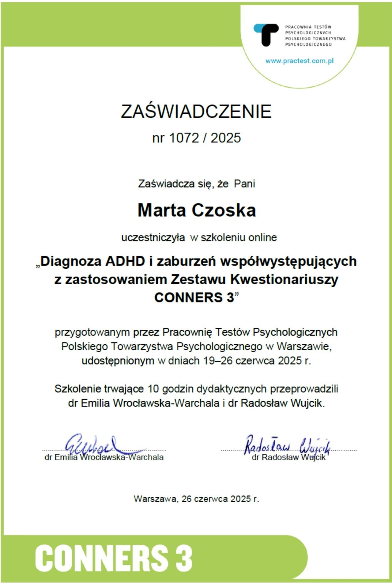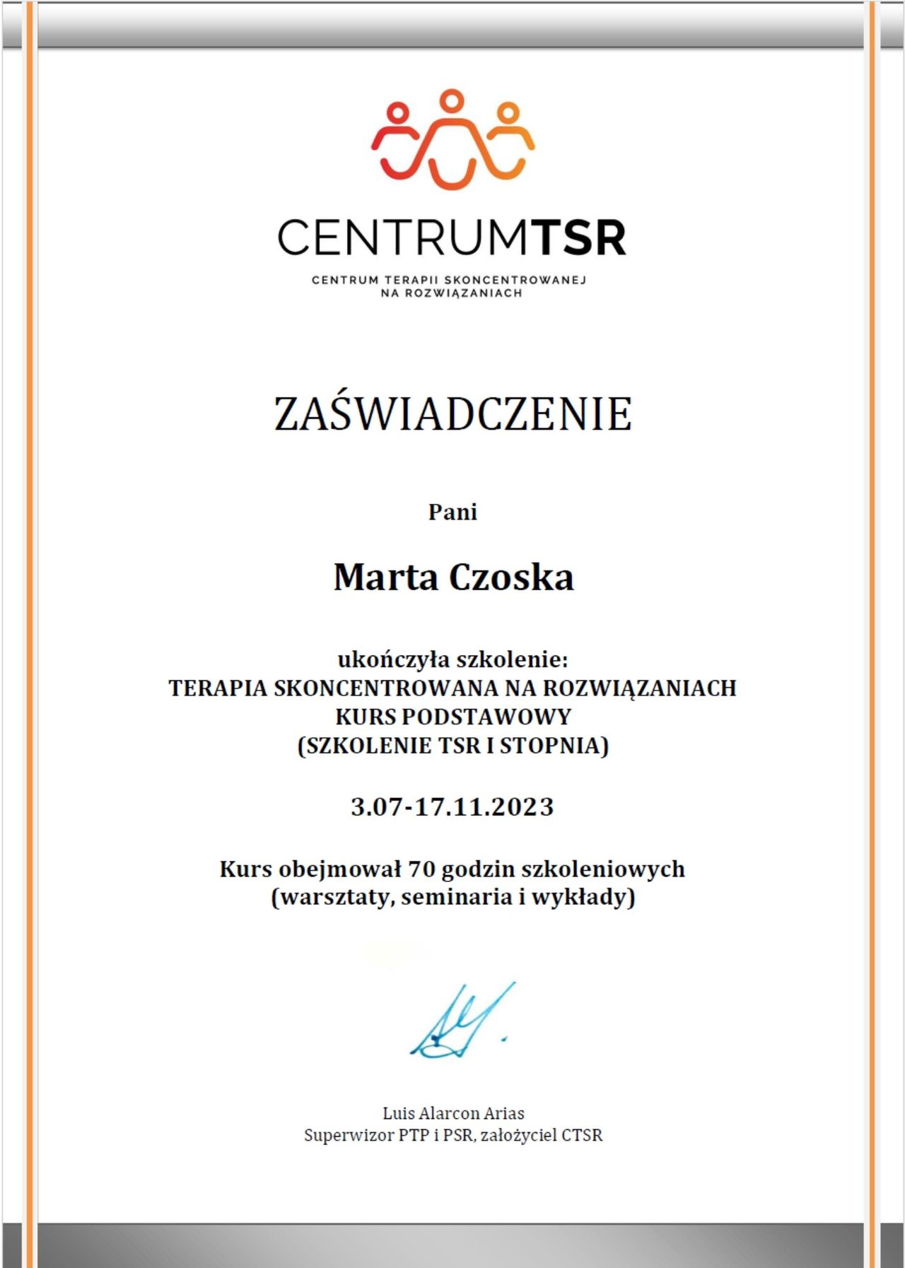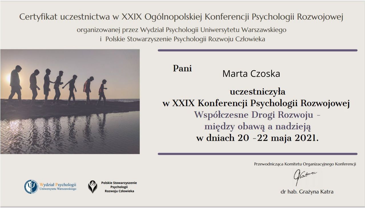 Ukończyłam kurs Terapii Skoncentrowanej na Rozwiązaniach (TSR) I stopnia, kurs diagnozy ADHD, kurs diagnozy zaburzeń osobowości (MMPI-2) oraz wiele innych szkoleń z zakresu psychoterapii, diagnostyki i pracy z osobami neuroróżnorodnymi.