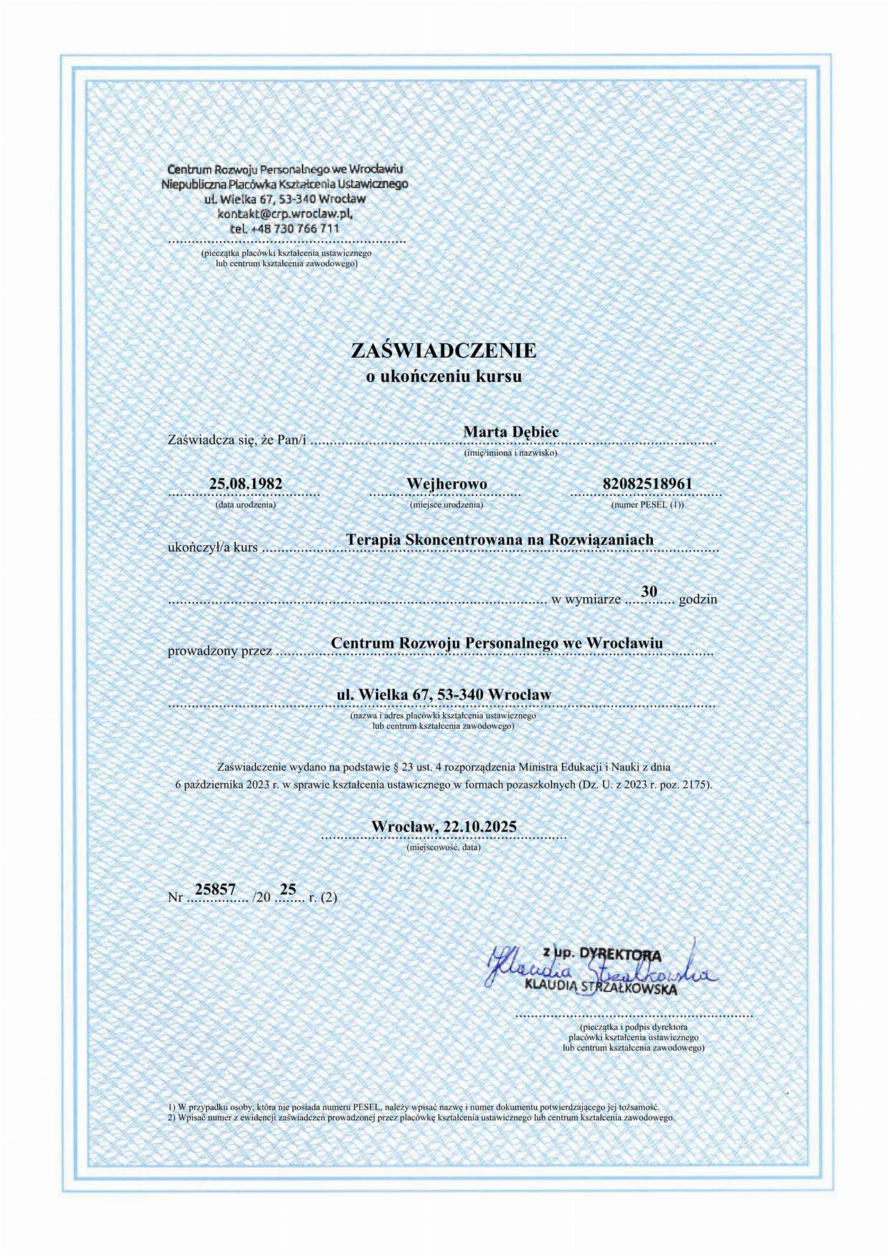 Od 18 lat pracuję z dziećmi i ich rodzinami. Pasja do mojego zajęcia skłoniła mnie do poszerzenia kwalifikacji o umiejętności i możliwości do wsparcia psychologicznego. Jestem magistrem psychologii wspomagania rozwoju człowieka, specjalizuję się we wspieraniu rozwoju dzieci i młodzieży. Poza pięcioletnimi studiami magisterskimi, ukończyłam również studia podyplomowe nakierowane właśnie na psychologię mlodszych podopiecznych. Moją pasją jest zgłębianie tajemnic ludzkich emocji. Ukończyłam kurs TSR (Terapia skoncentrowana na rozwiązaniach) oraz CBT (Terapia poznawczo- behawioralna). Jestem certyfikowanym diagnostą i terapeutą Terapii Ręki. Od dawna pracuje z dziećmi w spektrum autyzmu i niepełnosprawnymi intelektualnie. Wspieram dzieci i ch rodziny oraz pracuje z osobami dorosłymi, parami i rodzinami. Cały czas doszkalam się, zdobywając nowe kwalifikacje i, przede wszystkim, umiejętności. Jestem nauczycielem przedszkolnym i szkolnym oraz oligofrenopedagogiem.
