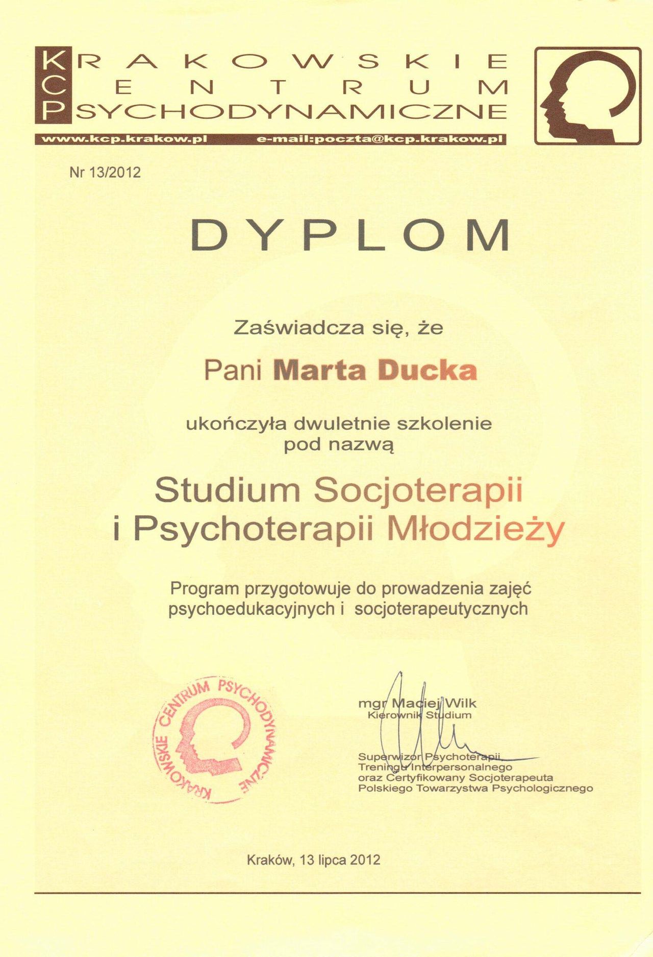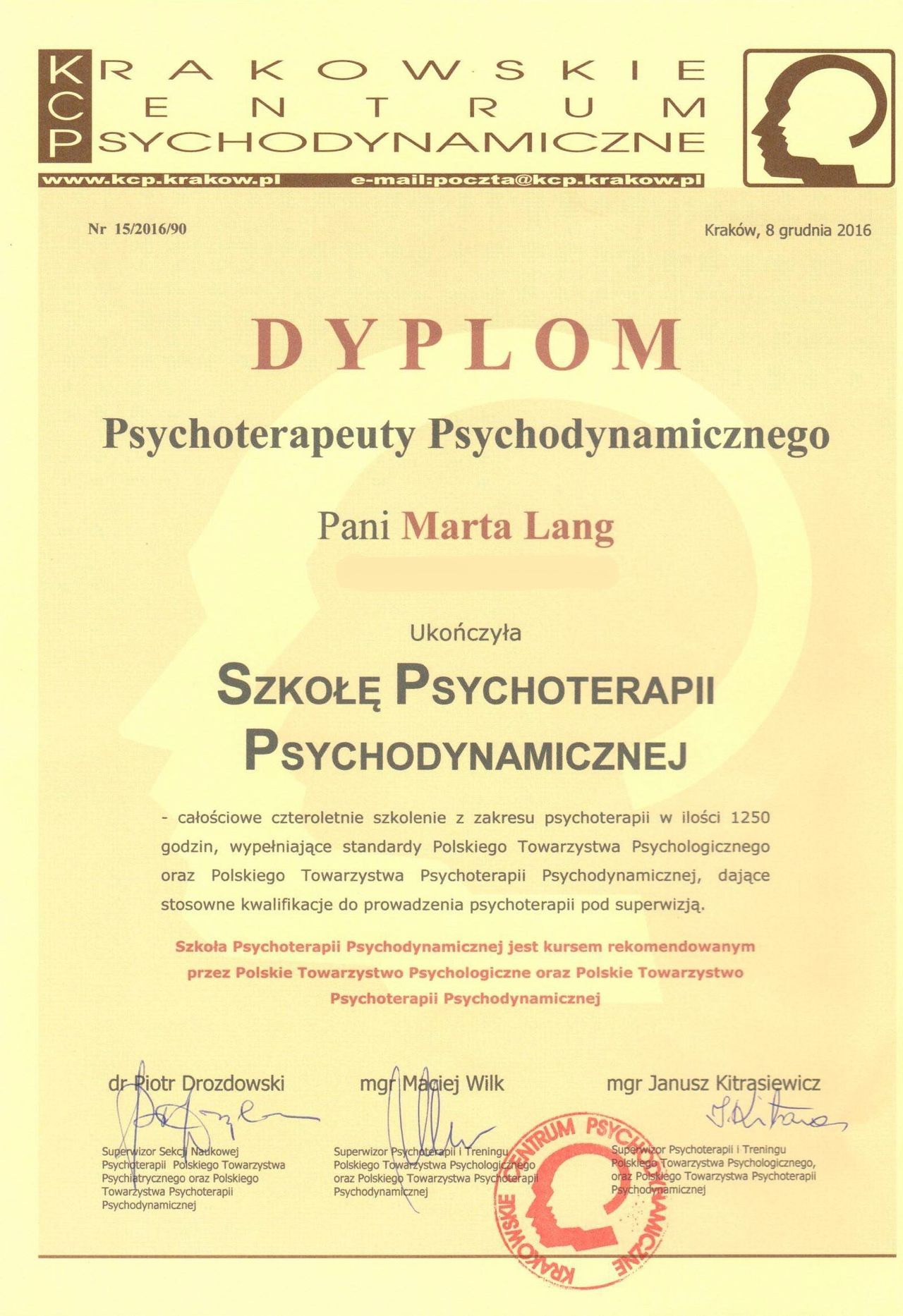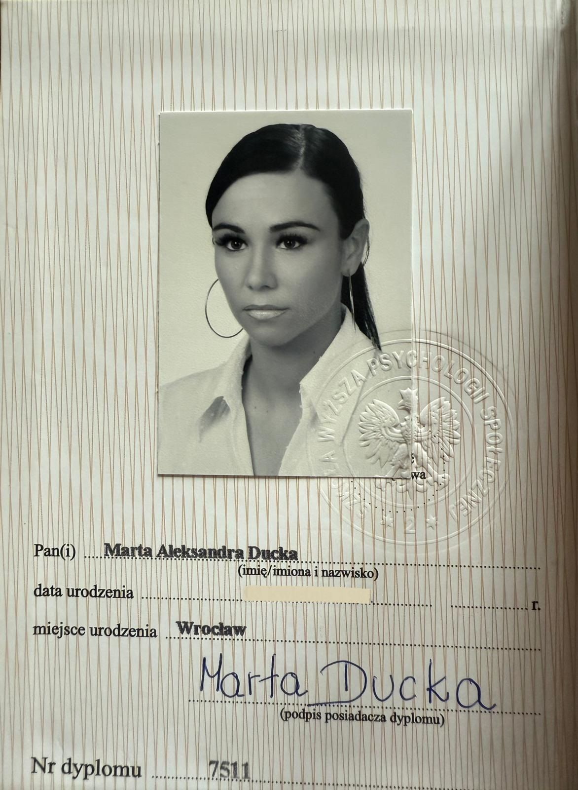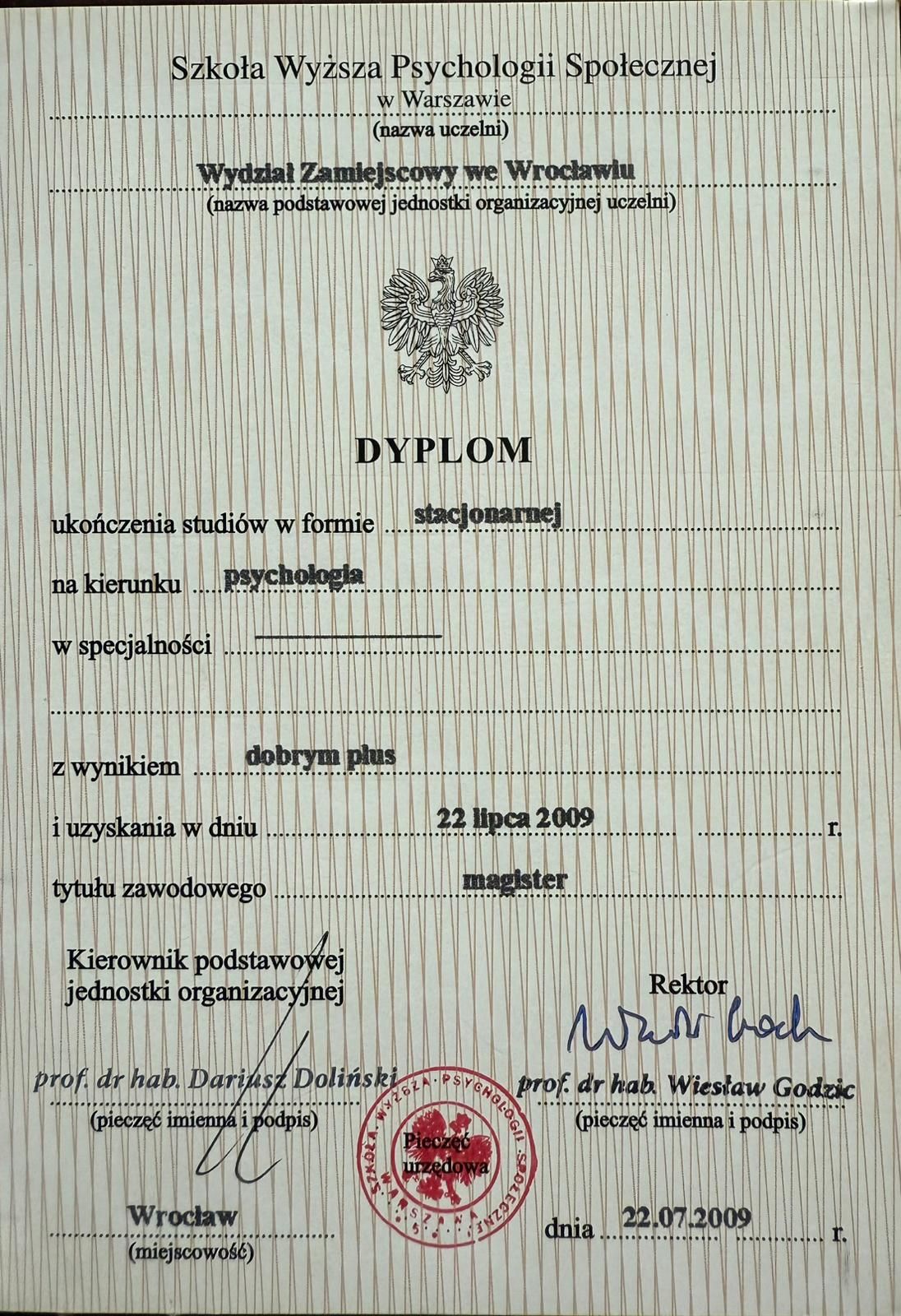 Mam 15 letnie doświadczenie zawodowe w prowadzeniu terapii osób dorosłych i młodzieży. Posiadam tytuł magistra psychologii. Specjalizowałam się z zakresu psychologii klinicznej. Studia ukończyłam w Wyższej Szkole Psychologii Społecznej we Wrocławiu. Swoją wiedzę poszerzałam także w dwuletnim Studium Socjoterapii i Psychoterapii Młodzieży oraz czteroletniej szkole Psychoterapii Psychodynamicznej. Oba kursy realizowane były w Krakowskim Centrum Psychodynamicznym które rekomendowane jest przez Polskie Towarzystwo Psychologiczne i Polskie Towarzystwo Psychiatryczne. Jestem także członkiem Polskiego Towarzystwa Psychoterapii Psychodynamicznej (PTPPd). Swoją pracę terapeutyczną poddaje regularnej superwizji u Superwizorów Polskiego Towarzystwa Psychologicznego, Psychiatrycznego i Polskiego Towarzystwa Psychoterapii Psychodynamicznej. Zaufanie i bezpieczeństwo osoby z którą pracuje jest dla mnie absolutnym priorytetem dlatego tez w swojej pracy przestrzegam Zasad Kodeksu Etyki Zawodowej Psychologa i Psychoterapeuty. Swoim pacjentom zapewniam anonimowość i dyskrecję. Główną zasadą którą kieruję się w swoim zawodzie to przede wszystkim empatia i otwartość wobec drugiego człowieka. Pozwala to stworzyć atmosferę w której pacjent może bez większych obaw opowiedzieć o swoich trudnościach. Nieustannie podnoszę swoje kwalifikacje biorąc udział w szkoleniach na terenie Wrocławia i Krakowa.