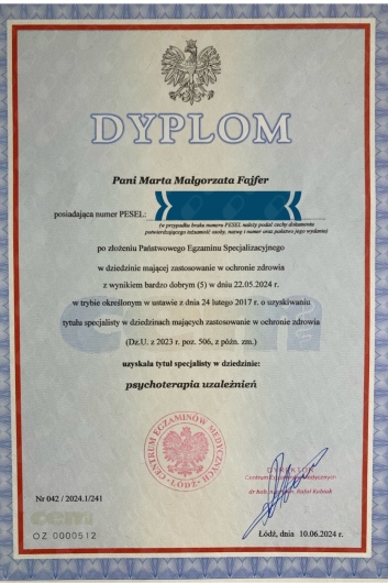 Moge polecic Pania Marte z reka na sercu! Długo szukałam psychterapeuty zanim dotarłam do Pani Marty Fajfer. Od razu poczułam, że jest osobą, która będzie w stanie mi pomóc i też się tak stało. Zdecydowałam się na długoterminową terapie że względu na swoje zaburzenia. Przerobiłysmy całe dzieciństwo, wszystkie trudne chwile związane z niepokojem, obawami i lękami. Było dużo łez, żalu, złości, ale opłacało się, aby osiągnąć obecny stan.