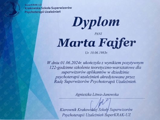 W latach 2020 - 2023 byłam dydaktyczką w Studium Terapii Uzależnień Błękitnego Krzyża w Pszczynie. Od marca 2023 roku posiadam status superwizora aplikanta w zakresie psychoterapii uzależnień przy Radzie Superwizorów Psychoterapii Uzależnień (nr zaświadczenia: 25) i wspieram specjalistów psychoterapii uzależnień poprzez superwizję ich pracy z osobami z uzależnieniem, syndromem współuzależnienia oraz syndromem dda.