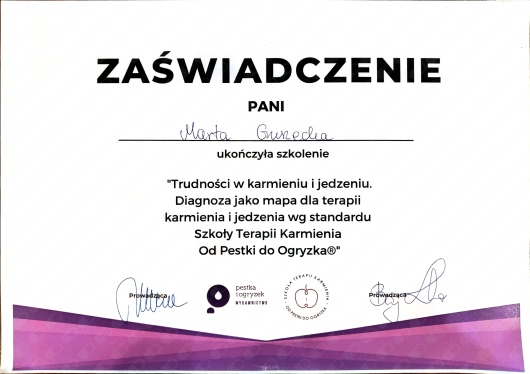 Najlepszą opinią dla pracy Pani Marty niech jest to, że jest jedyną specjalistką, do której mój syn dosłownie biegnie na zajęcia i nie szuka wymówek Ciepła, kompetentna, rzetelna, z masą pomysłów na swoje zajęcia. Gorąco polecamy!