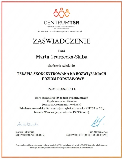 Bardzo polecam współpracę z Panią Martą. Od pierwszego spotkania czułam się wysłuchana, a zadawane pytania przez Panią Martę były trafione i pomagały mi bardziej zrozumieć to z czym przychodzę i dlaczego coś się dzieję. Bardzo mocno polecam, bo dostałam ogrom wsparcia, zrozumienia, a to co wcześniej wydawało się trudne teraz jest bardziej zrozumiałe i łatwiejsze.