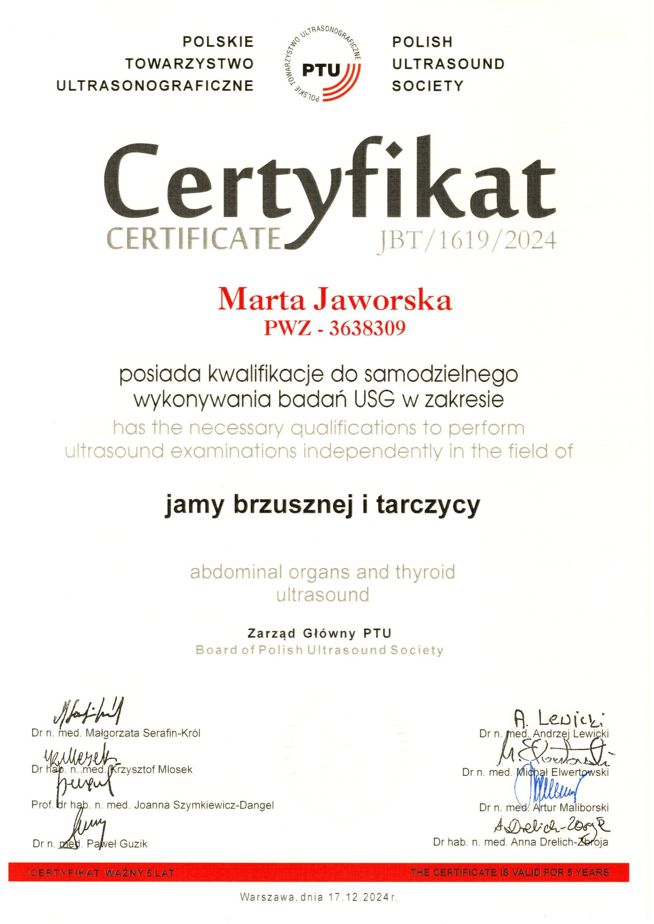 Dysponuje certyfikatami umiejętności wykonywania kapilaroskopii, USG jamy brzusznej i tarczycy.