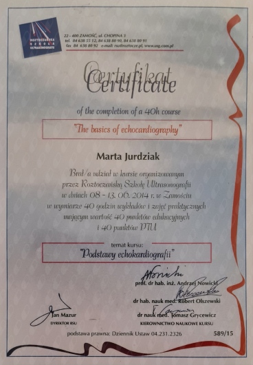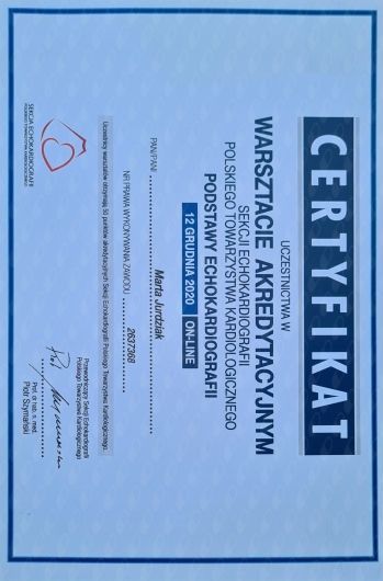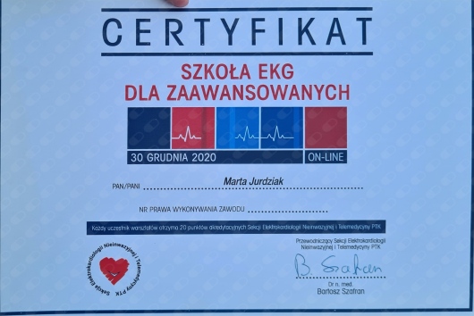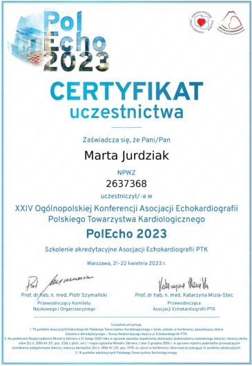 Jaki jest zakres porad oferowanych przez Marta Jurdziak?Marta Jurdziak to kardiolog, internista. Na podstawie swojego doświadczenia i wykształcenia Marta Jurdziak oferuje usługi takie jak: konsultacja kardiologiczna (kolejna wizyta), konsultacja kardiologiczna (pierwsza wizyta), konsultacja kardiologiczna + ECHO serca, konsultacja kardiologiczna + EKG, konsultacja kardiologiczna + EKG + ECHO serca, konsultacja kardiologiczna + USG, konsultacja kardiologiczna, konsultacja kardiologicza + USG echo serca, konsultacja kardiologiczna + ECHO serca + EKG (pierwsza wizyta), Konsultacja kardiologiczna + EKG (pierwszorazowa).