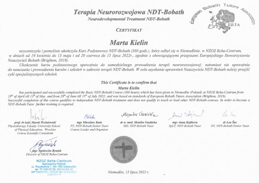 Jestem fizjoterapeutką oraz certyfikowaną terapeutką NDT-Bobath. Prowadzę terapię dzieci i niemowląt. Zgłaszają się do mnie rodzice z dziećmi z asymetrią ułożeniową, zaburzeniami napięcia mięśniowego, opóźnionym rozwojem psychoruchowym oraz urodzonymi przedwcześnie. Pomagam dzieciom z mózgowym porażeniem dziecięcym, ze spektrum autyzmu, Zespołem Downa oraz z innymi wadami genetycznymi.