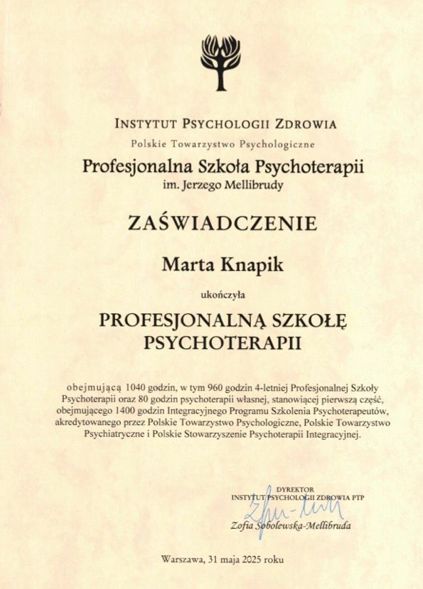 Ukończyłam 4-letnie szkolenie psychoterapeutyczne w Profesjonalnej Szkole Psychoterapii w Instytucie Psychologii Zdrowia PTP w Warszawie (akredytowanego przez Polskie Towarzystwo Psychologiczne, Polskie Towarzystwo Psychiatryczne i Polskie Stowarzyszenie Psychoterapii Integracyjnej). Swoją pracę poddaję regularnej superwizji. Jestem członkiem Polskiego Towarzystwa Psychiatrycznego.